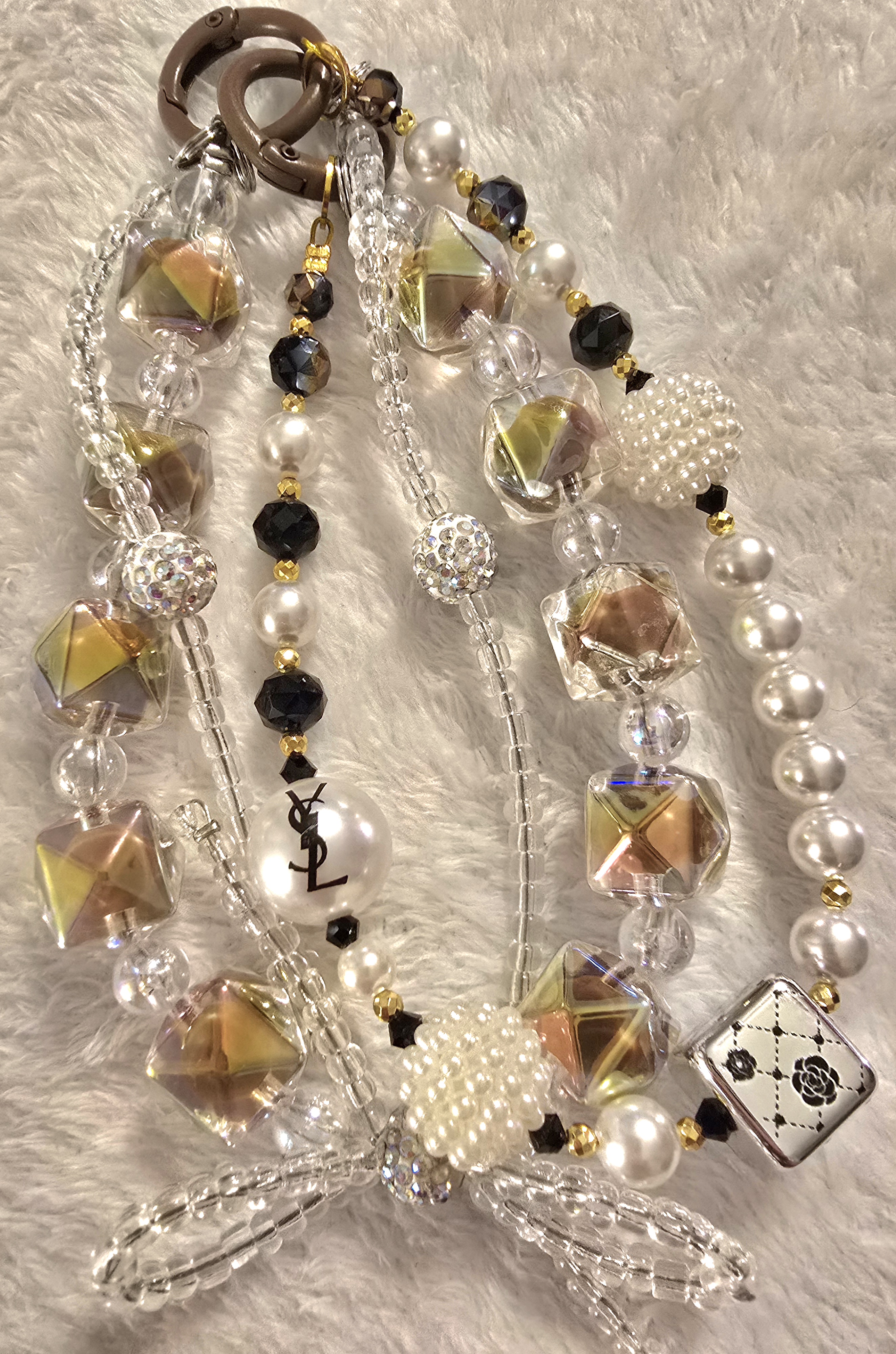 A symphony of shimmer and sophistication, the Opaline Reverie chain evokes the elegance of twilight in Paris. At its heart, a luminous YSL pearl bead glows with quiet prestige, flanked by rhinestone-encrusted spheres that sparkle like chandelier light. Iridescent cube beads shift from lavender to ice blue with every movement, casting prismatic reflections that dance across the skin.