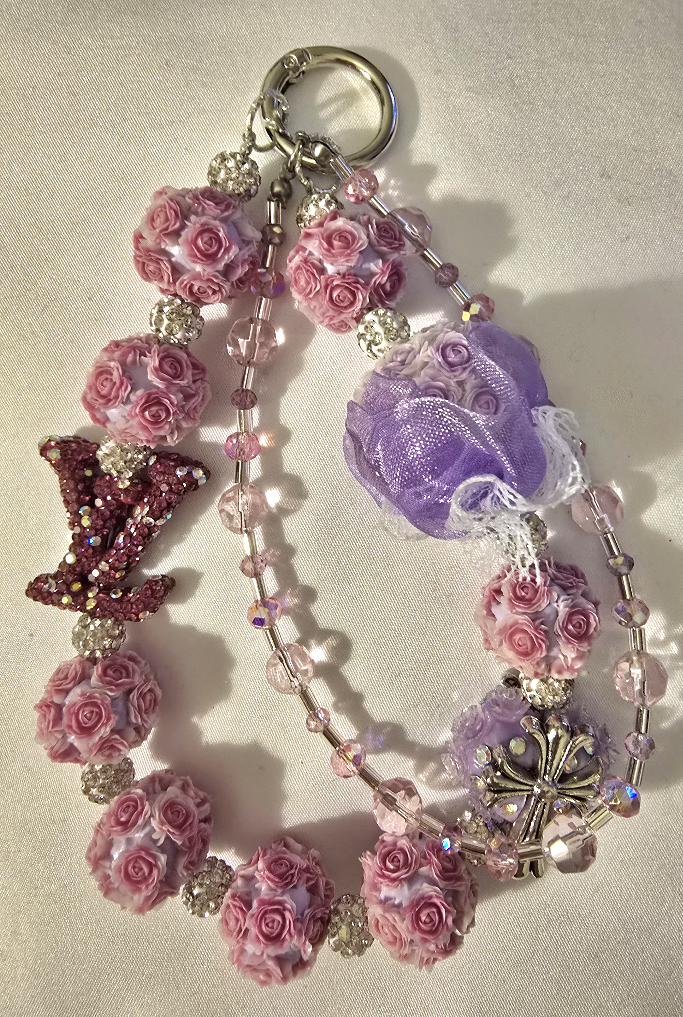 This luxurious chain is a visual feast of romantic charm and eclectic elegance. A cascade of soft pink rose beads evokes a timeless feminine touch, while faceted crystal-like spheres and dazzling glitter beads catch the light for a glamourous sparkle.