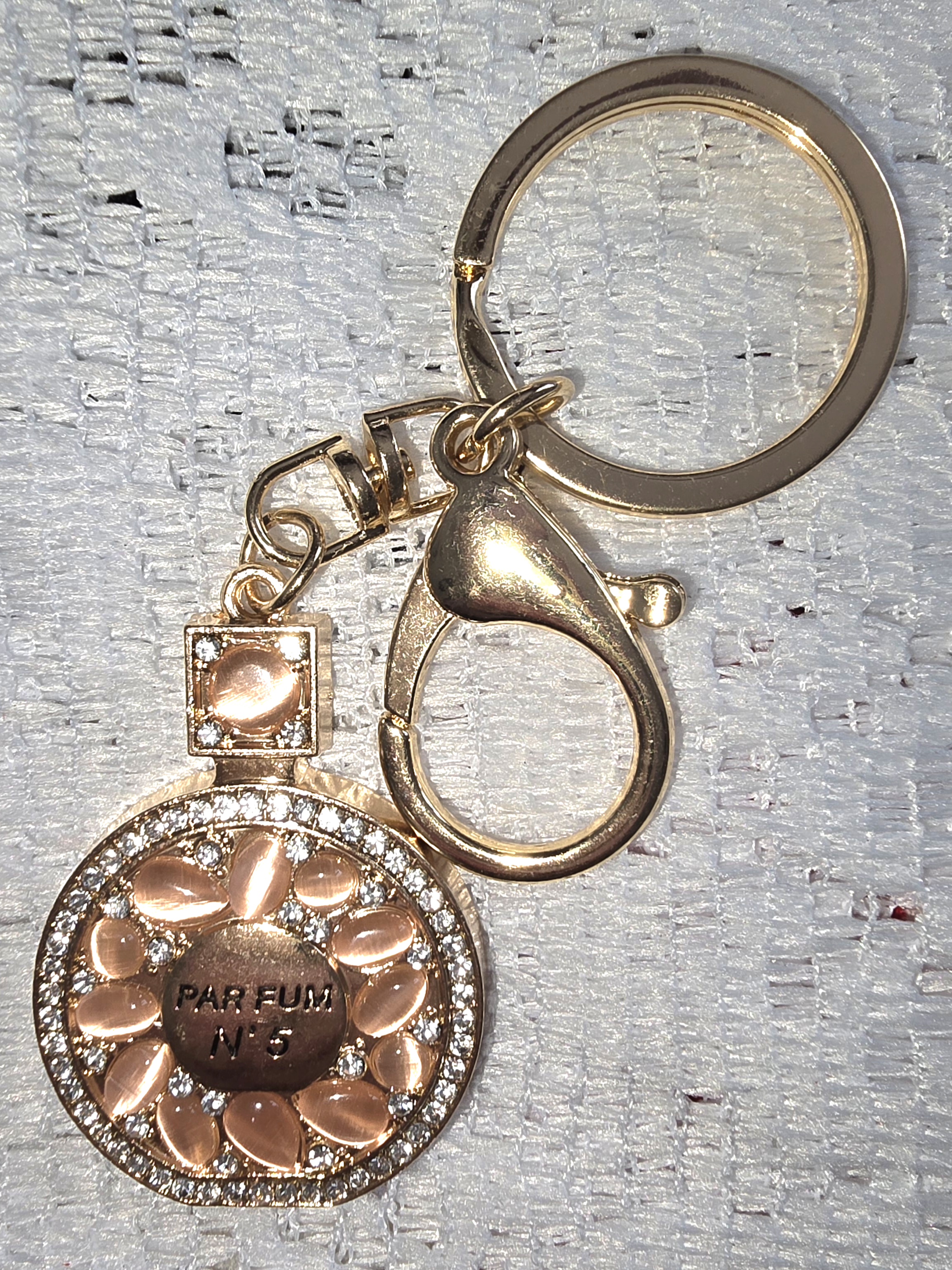 This keychain is a miniature ode to luxury, styled as a gilded perfume bottle pendant with a nod to the iconic CC Perfume N°5. The circular charm is encrusted with peach-toned oval stones, each delicately framed by a halo of clear rhinestones that shimmer like cut glass. At its heart, the engraved “PARFUM N°5” evokes timeless elegance, while the gold-tone finish and dual clasp design add both function and flair. It’s a statement piece—part charm, part couture fantasy.