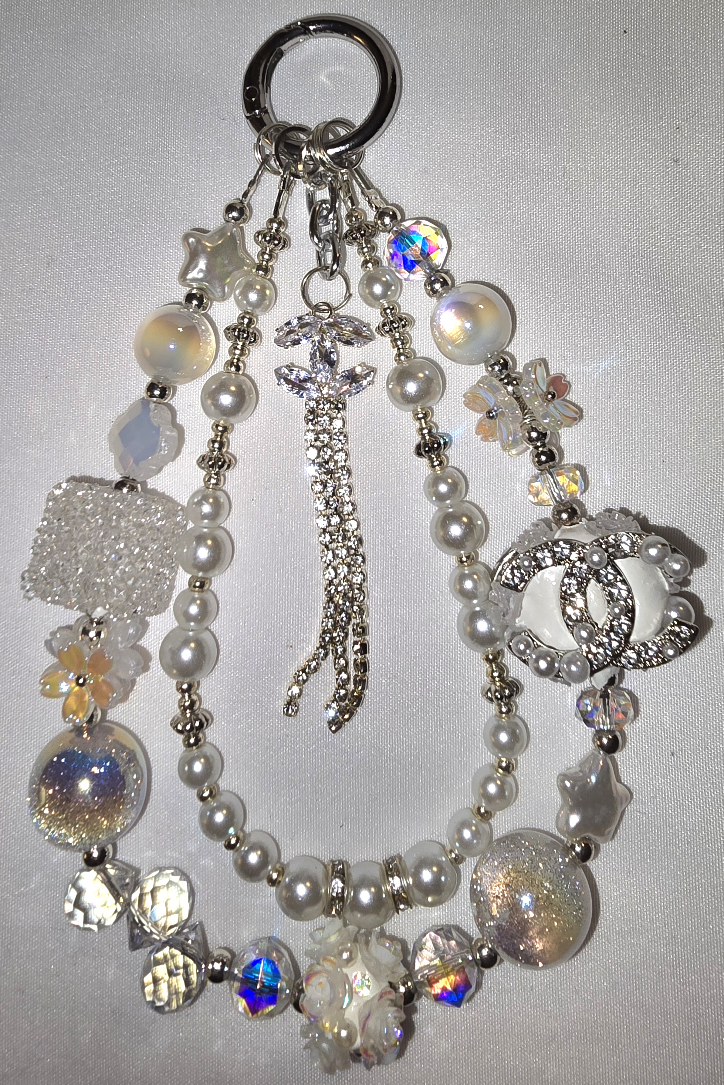 This accessory is a dazzling celebration of opulence and whimsy. Suspended from a central ring, two elegant strands cascade with faux pearls, iridescent beads, and metallic spacers, evoking the shimmer of moonlight on water. A rhinestone-studded tassel adds movement and drama, while the pièce de résistance—a rhinestone-encrusted double “C” logo—anchors the piece in unmistakable luxury. Scattered throughout are star-shaped and flower-shaped beads, glitter-filled spheres, and a cube of crystalline brilliance, each element contributing to a celestial, dreamlike aesthetic. It’s a miniature galaxy of glamour, perfect for adorning a handbag, keyring, or charm bracelet.