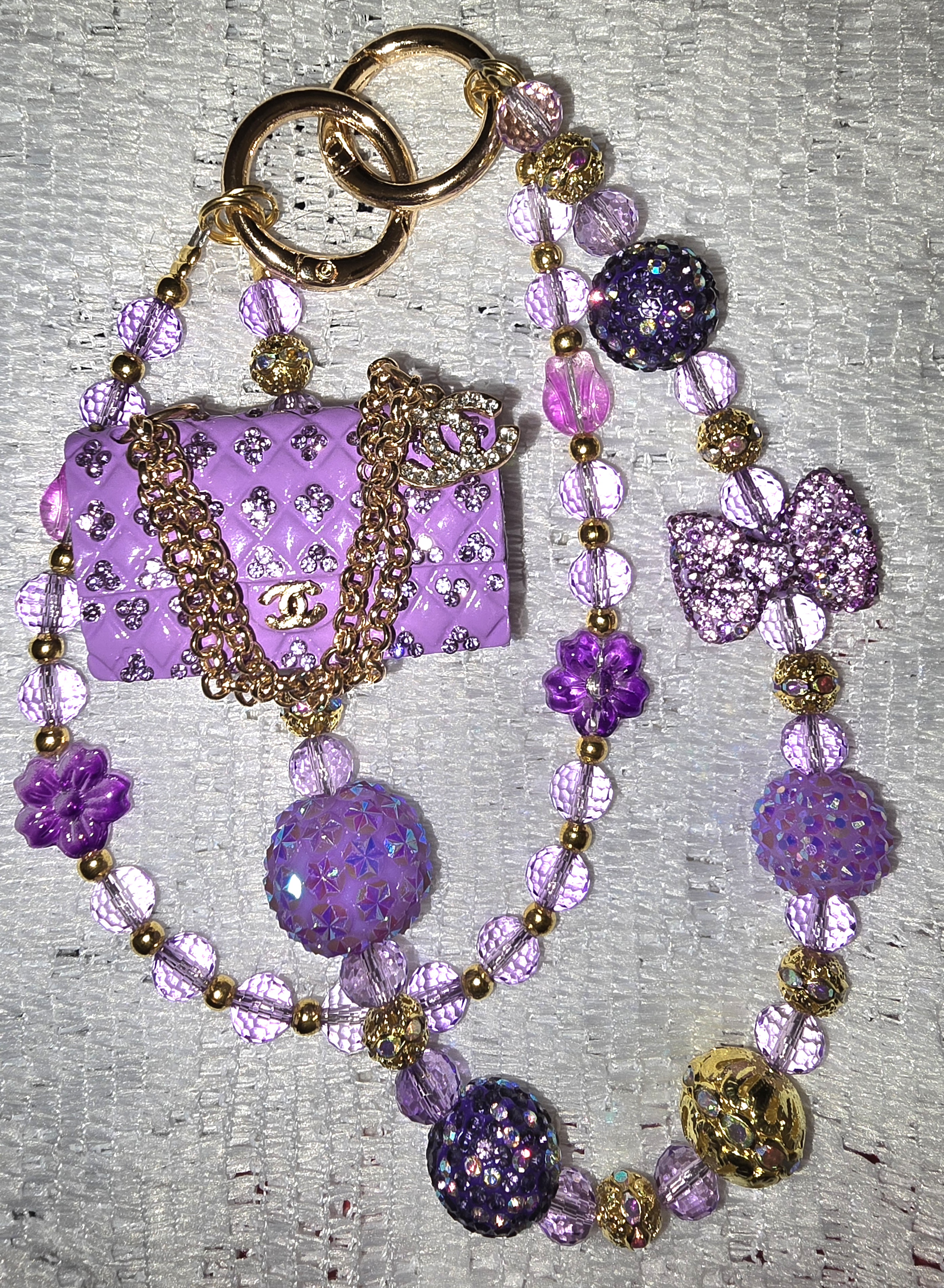 This accessory ensemble is a dazzling tribute to playful luxury. At its heart is a miniature purple handbag charm encrusted with rhinestones, suspended from a gold chain and crowned with a tiny CC logo—like a couture treasure scaled for a dollhouse soirée. Surrounding it, a beaded strand glimmers with oversized glitter spheres in violet and sapphire, faceted lilac crystals, and golden spacers. A glittery bow and flower-shaped beads add a touch of enchanted whimsy, evoking a fairytale garden party under moonlight. The entire composition feels like a curated vignette from a fashion fantasy—where elegance meets imagination.