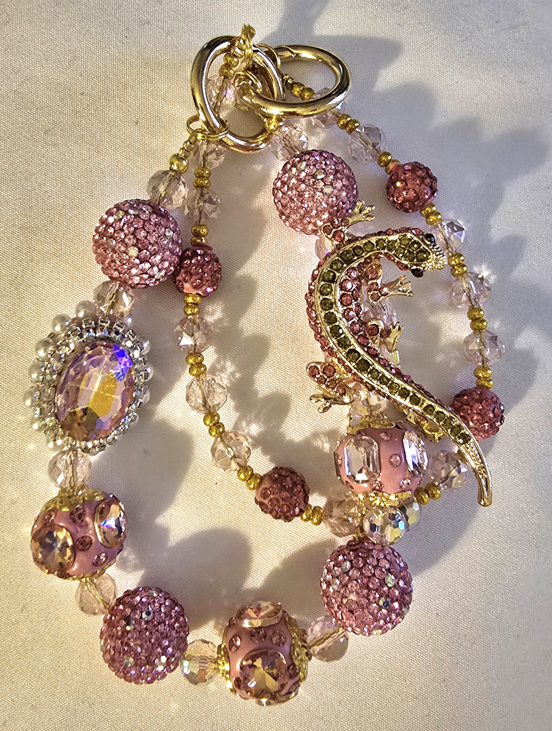 The pièce de résistance? A glittering gecko charm, drenched in pink and gold crystals, slinks beside a regal oval gem encircled by a halo of brilliance. Held together by polished golden rings, this chain is a celebration of charm—literally.