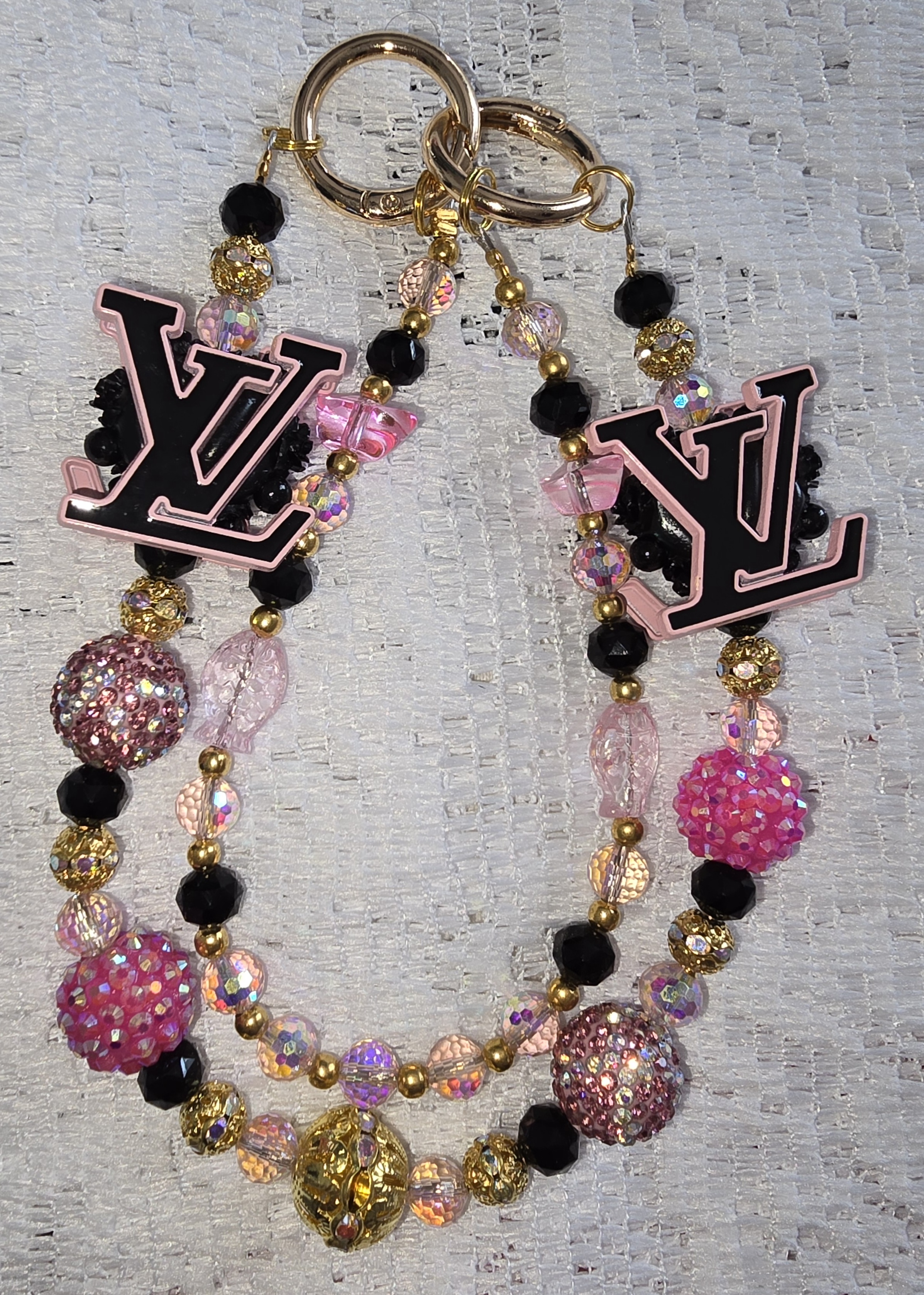 A dazzling duo of accessory chains that channel high-glam charm with a touch of fantasy. Each piece features a curated mix of beads—glittering pinks, glossy blacks, iridescent shimmer, and luxe golds—arranged in a rhythm of texture and shine. The centerpiece is a bold LV logo charm in black with a pink outline, anchoring the design in unmistakable designer heritage. Gold-toned hardware adds polish, making these ideal as keychains, bag charms, or statement phone accents. The overall vibe is luxe-meets-playful, perfect for fashion lovers who adore branded sparkle with personality.