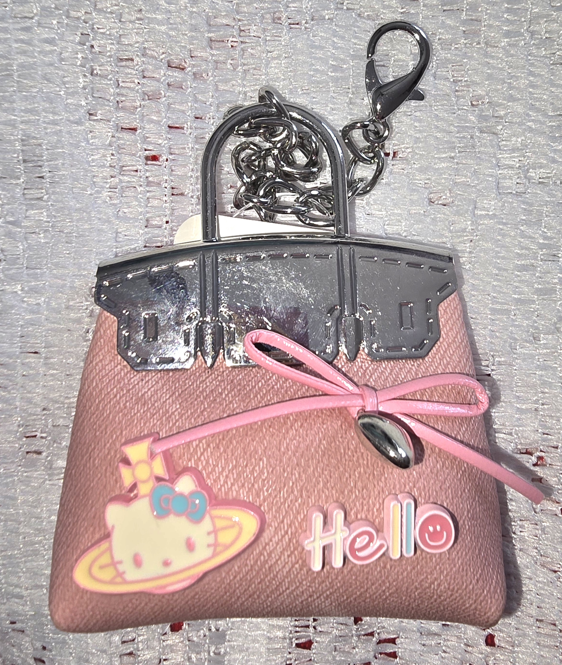 A miniature purse-shaped keychain in glossy bubblegum pink, trimmed with a metallic silver top and handle for a touch of glam. The front features a satin pink bow with a silver bead center—like a dainty gift wrap for the charm beneath. HK sits sweetly inside a golden Saturn ring, wearing a blue bow and gazing outward with her signature calm. The word “Hello” pops beside her in rainbow-hued letters, adding a cheerful, retro vibe. The clasp and chain make it easy to attach to bags, zippers, or charm bracelets, turning any accessory into a statement of kawaii-meets-celestial chic.