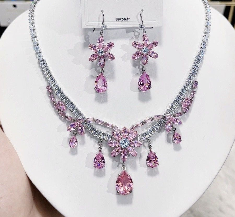 This jewelry set is a romantic symphony of sparkle and softness 💖. The necklace features a graceful arrangement of clear stones along the chain, leading to a centerpiece of pink gemstones shaped into delicate floral clusters. Each flower is crowned with a teardrop-shaped pink gem that dangles like a petal caught mid-fall—elegant, emotive, and full of movement.
