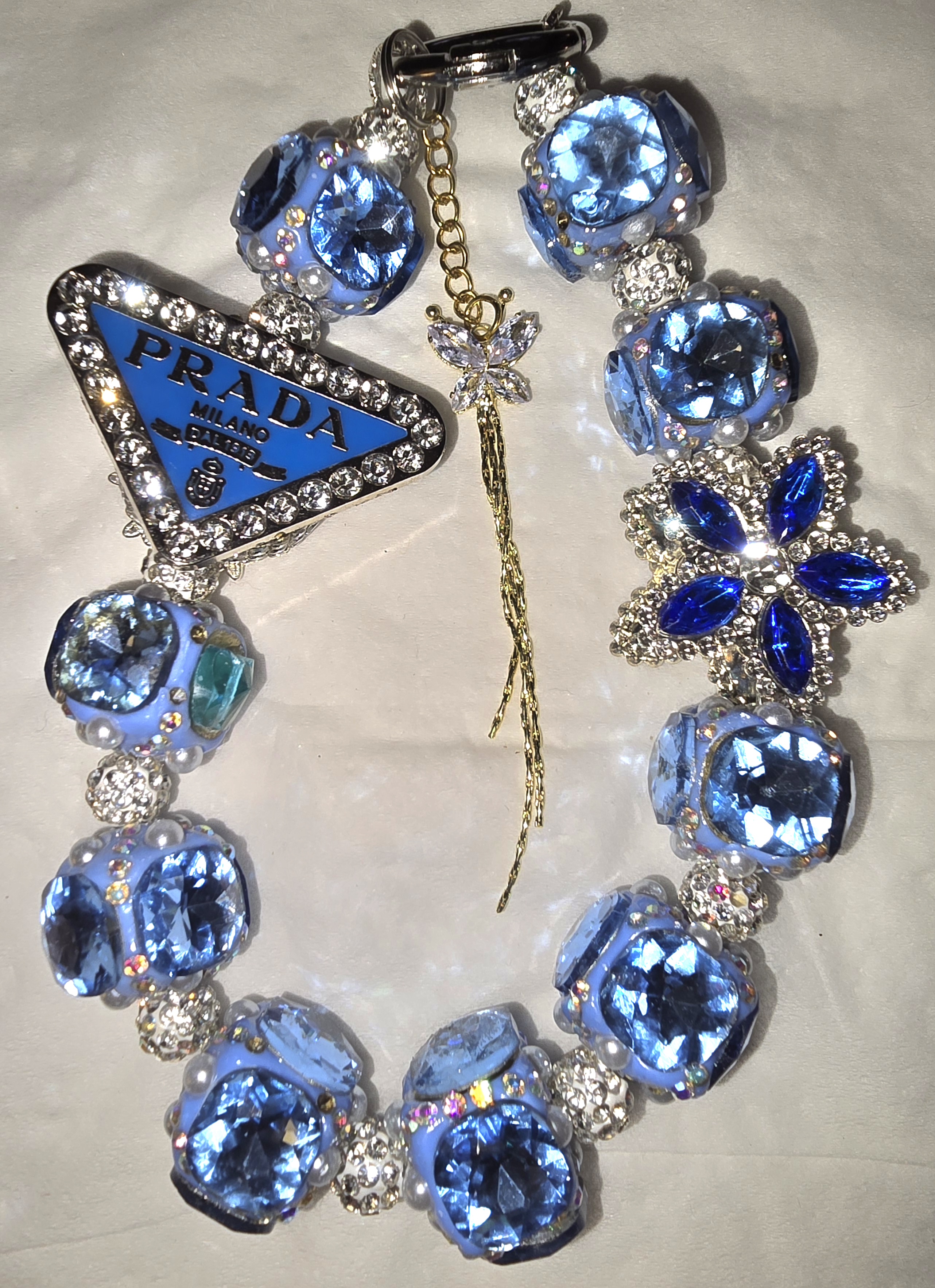 - Centerpiece Charm: A triangular Prada logo charm, adorned with shimmering blue enamel and rhinestones, anchors the design with iconic flair.