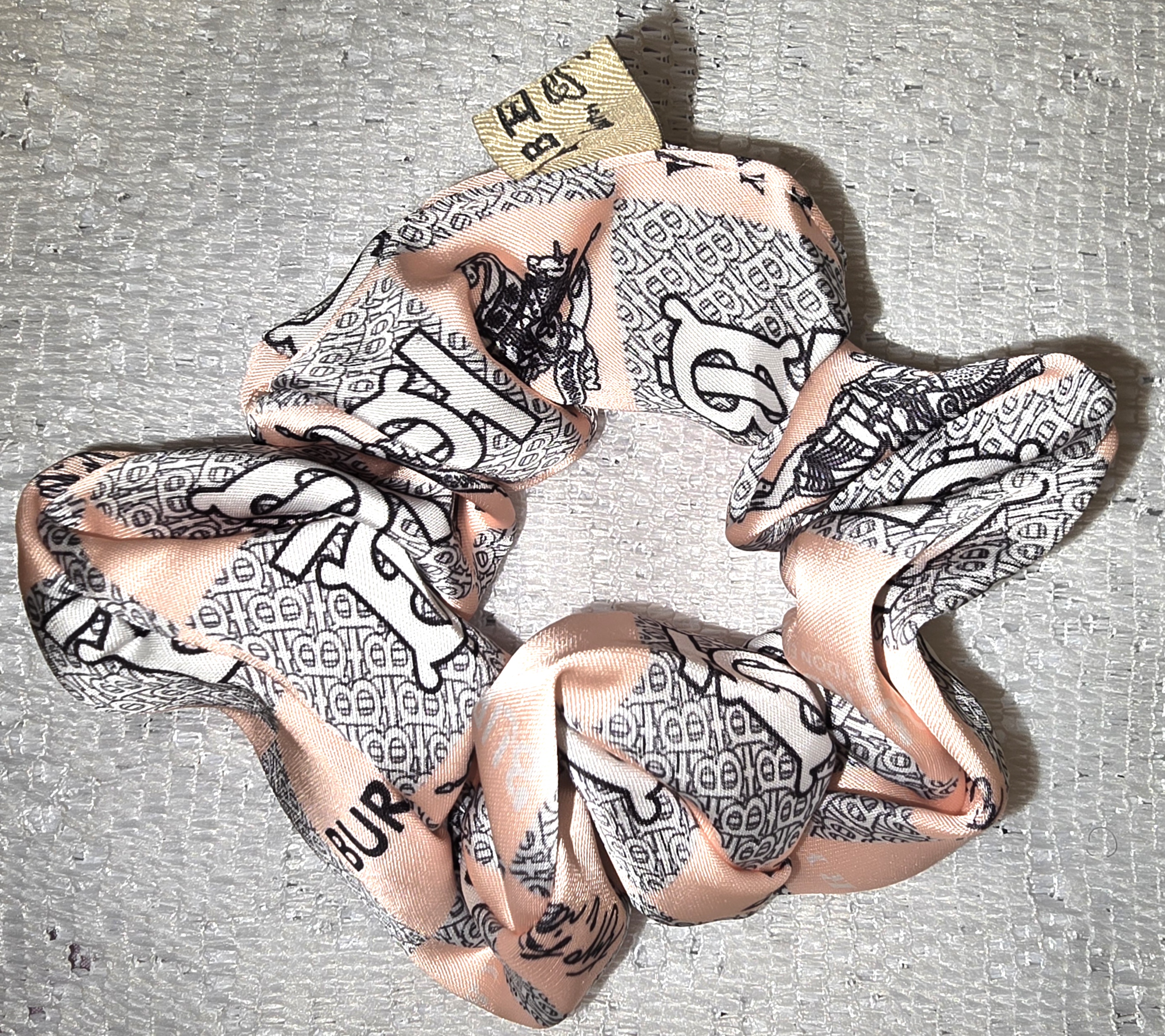 This scrunchie is a luxurious, silky accessory in a soft blush pink, adorned with bold black illustrations and text. The design features a dynamic mix of motifs: a knight on horseback evokes heritage and valor, while the stylized word “explore” repeats in a playful, modern font. The prominent “BURBERRY” branding adds a layer of prestige, blending classic British elegance with streetwise edge. A small tag with Asian characters and a face illustration hints at global influences, making this piece feel cosmopolitan and collectible. The overall vibe is adventurous, artistic, and high fashion.