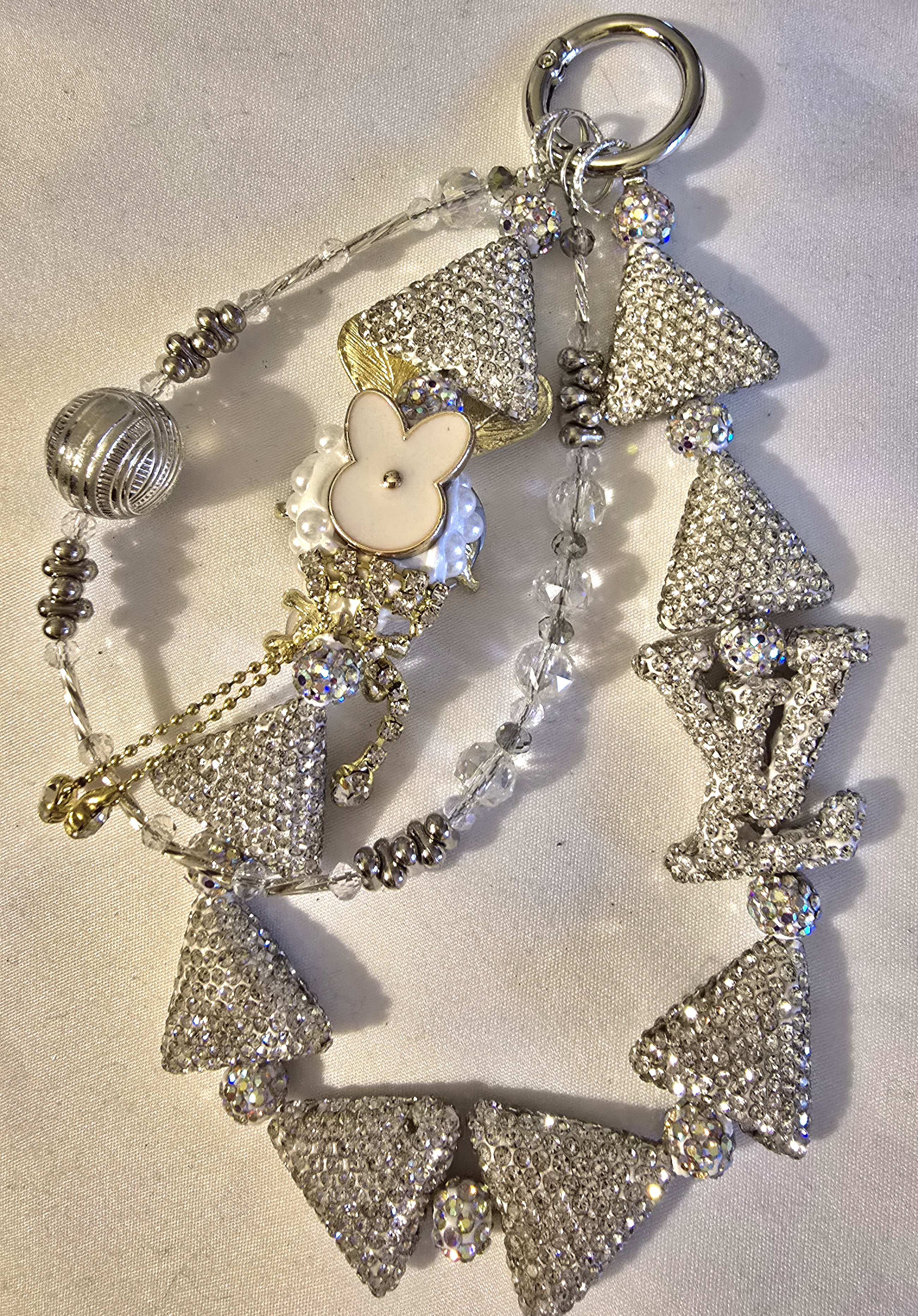 ✨ This dazzling statement piece captures the essence of luxury with its dramatic play of sparkle and geometry. Suspended from a fine metal chain are multiple triangular pendants, each encrusted with rhinestones that shimmer like stardust. These faceted accents are complemented by clear and metallic beads that alternate along the strand, adding a rhythmic texture to the overall design.