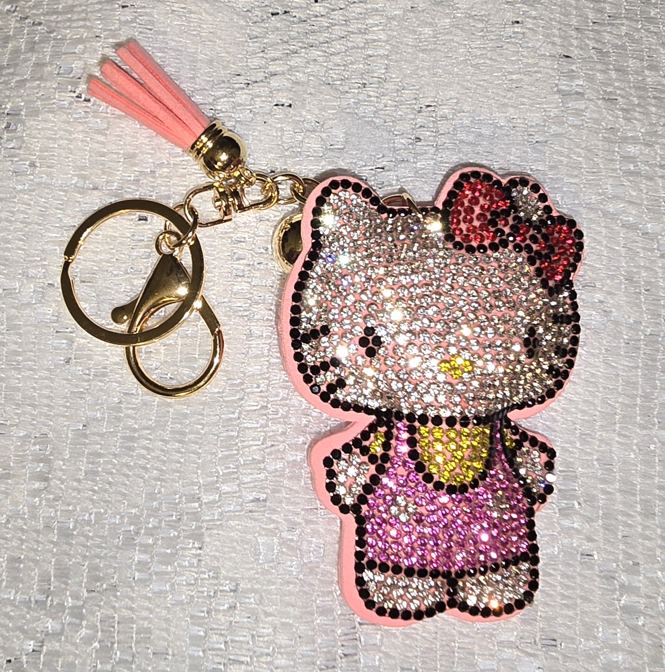 This dazzling Hello Kit keychain is a miniature celebration of playful luxury. The iconic feline is encrusted in a kaleidoscope of rhinestones—pink, red, white, black, yellow, and silver—creating a sparkling mosaic that catches the light from every angle. Her signature red bow pops against the glittering backdrop, while a pink outfit with a cheerful yellow accent adds charm and warmth. A gold-toned ring and clasp lend a touch of elegance, and the soft pink tassel adds movement and flair. Set against a delicate lace background, the piece feels like a whimsical treasure plucked from a dreamworld of couture cuteness.