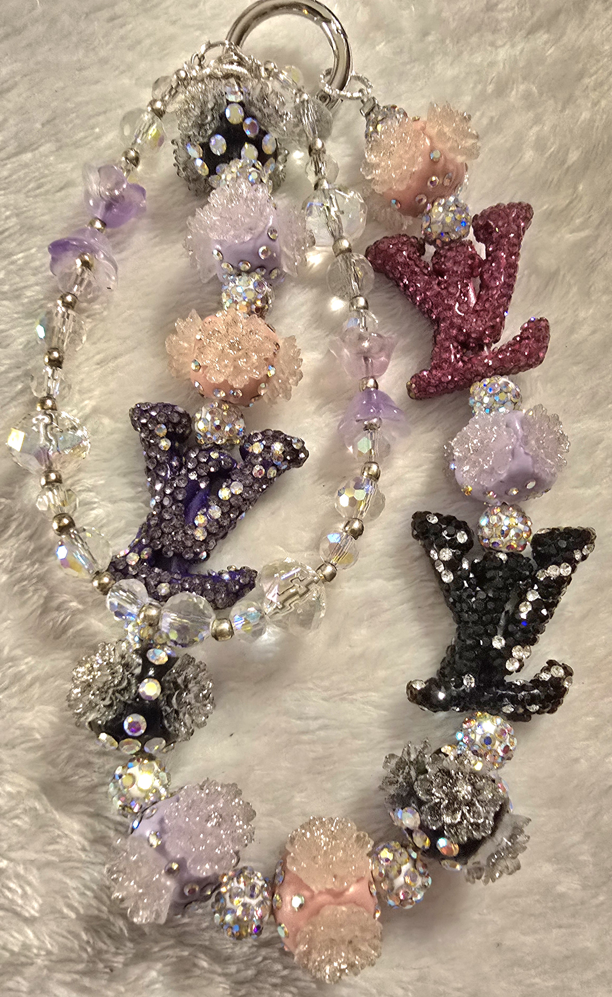 ✨ This designer accessory chain is a dazzling fusion of luxury and playful charm. It features a mix of glossy beads that glow in the dark in pink, purple, black, and silver tones, each one catching the light with a subtle sparkle. The standout elements are the rhinestone-encrusted “LV” charms, which lend a bold nod to iconic branding and elevate the piece with unmistakable glamour.