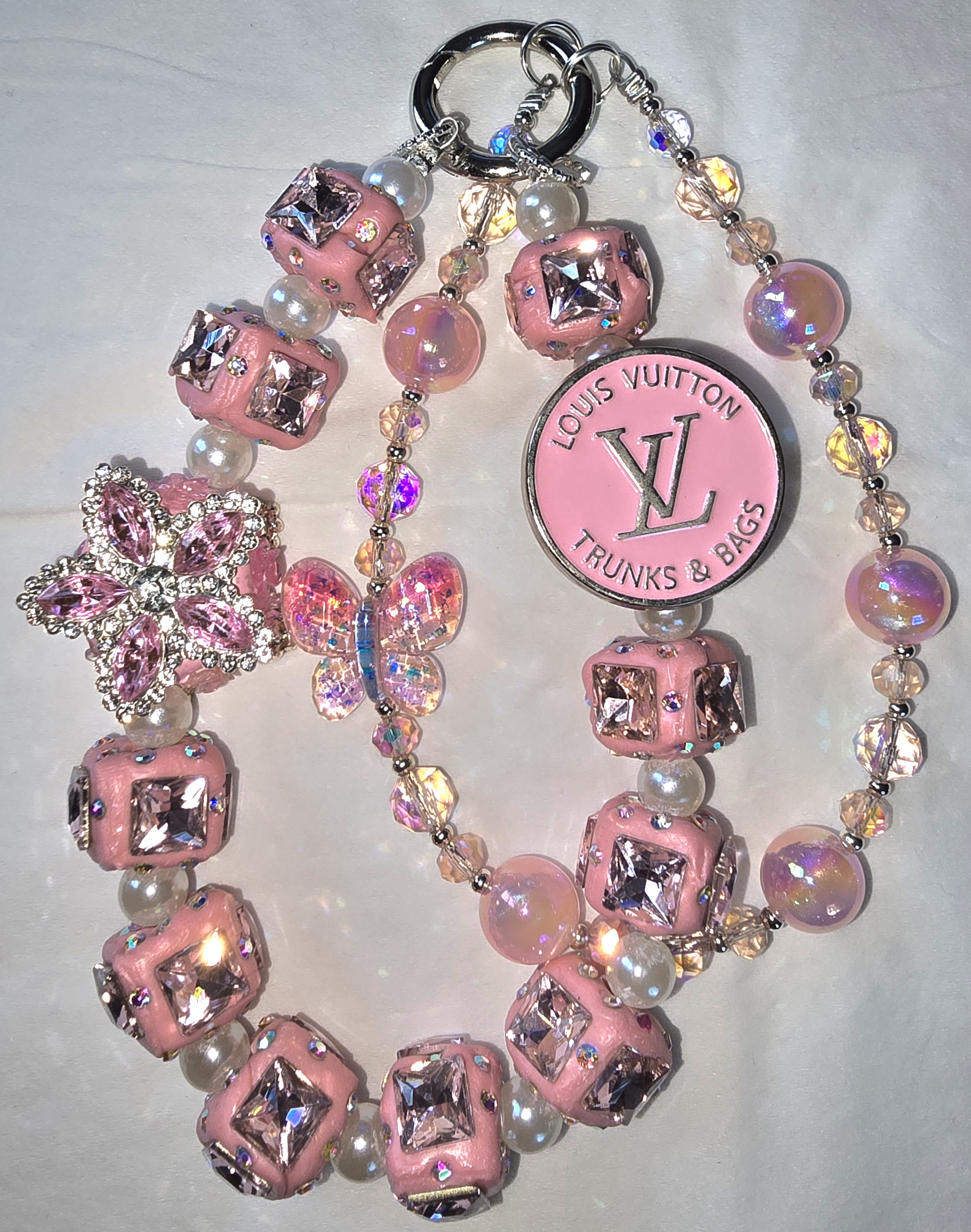 A playful ode to Parisian prestige, this designer accessory chain dazzles with oversized blush beads inset with square-cut rhinestones, creamy pearls, and iridescent accents that catch the light like fairy dust. The centerpiece—a bold pink medallion stamped with “LV TRUNKS & BAGS”—anchors the piece in iconic heritage. Surrounding it, a butterfly with holographic wings flutters beside a rhinestone-studded flower, evoking a garden of couture dreams. Finished with a sleek metal clasp, this chain is perfect for adorning handbags, belt loops, or even as a statement phone charm.
