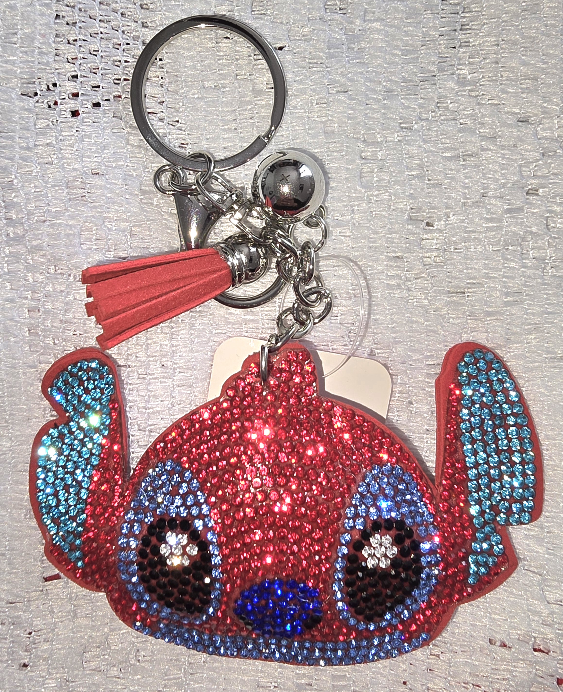 This dazzling keychain transforms Stitch into a rhinestone-studded icon of playful luxury. His expressive face is rendered in shimmering red and blue crystals, with oversized black-and-white gem eyes that sparkle with mischief. The blue nose and inner ears add a cool contrast, while the red tassel and metallic bell bring movement and charm. The gold-toned clasp makes it easy to attach to bags, keys, or even a designer tote, turning any accessory into a statement of whimsical fandom. It’s a perfect fusion of pop culture and glam—ideal for collectors who love a touch of sparkle with their character pieces.