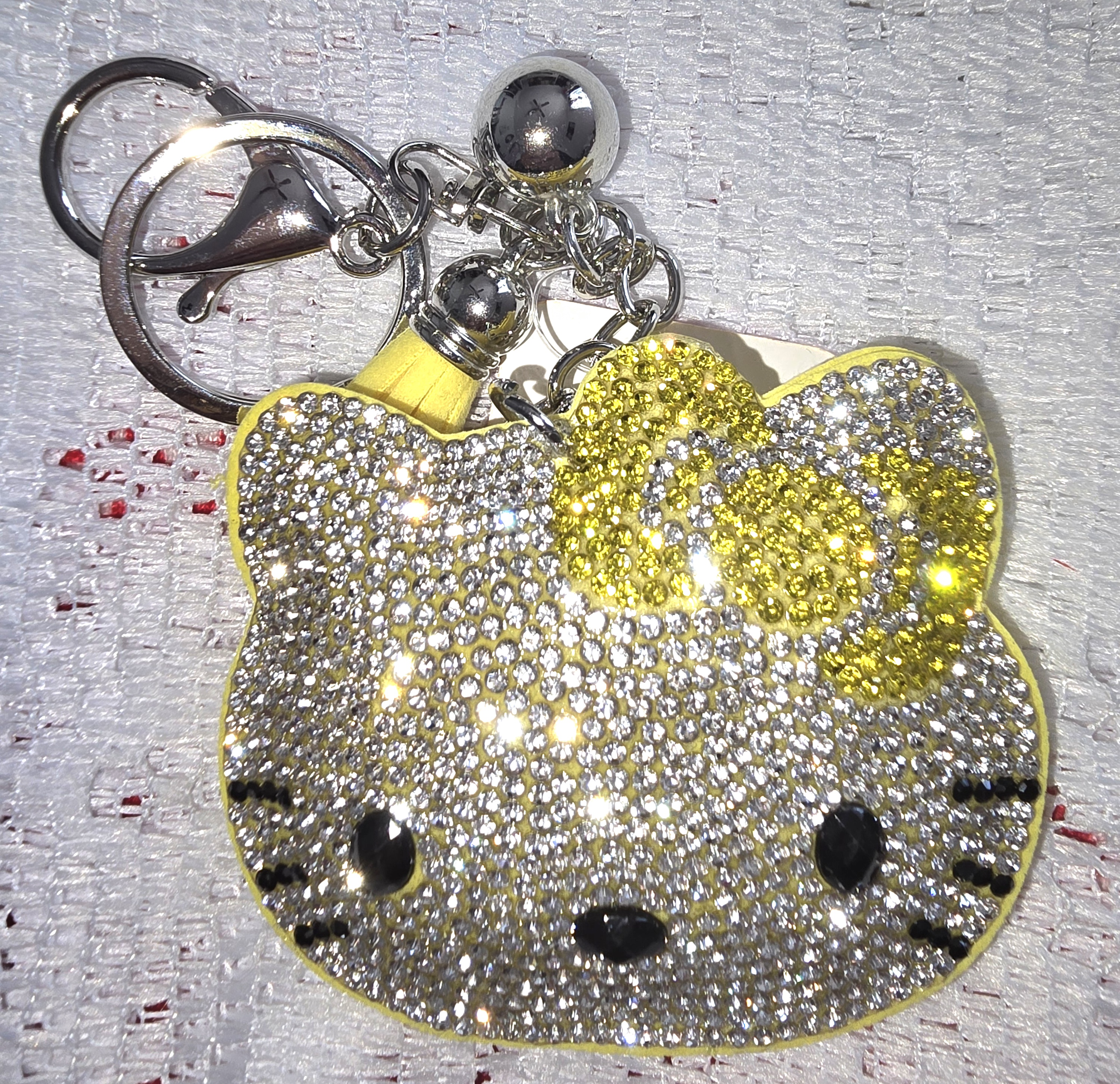This dazzling HK keychain is a miniature masterpiece of sparkle and charm. Her iconic face is encrusted with shimmering clear rhinestones, while her signature bow pops in radiant yellow crystals—adding a playful twist to the classic look. Glossy black accents define her eyes, whiskers, and nose with crisp precision. A silver bell and sunny yellow strap complete the ensemble, making it as functional as it is fabulous. Whether clipped to a designer tote or dangling from a luxe pouch, it’s a glittery nod to kawaii culture with a touch of glam.
