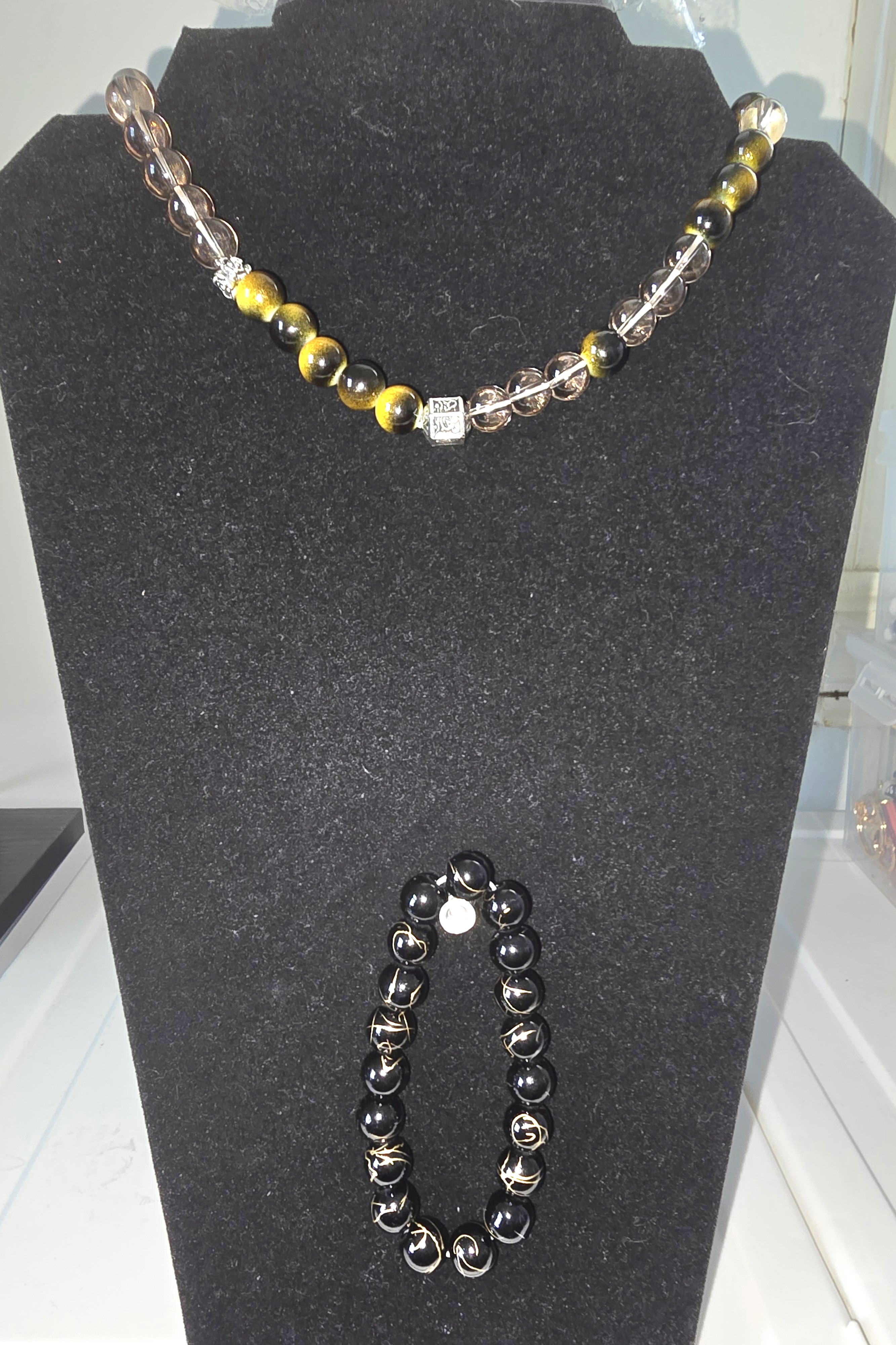A modern ode to love and balance, the Twist of Devotion Set pairs bold black and radiant yellow beads in a rhythmic dance of contrast. The necklace features a central silver cube engraved with “LOVE,” anchoring the piece with sentiment and shine. Twisted metallic wire adds sculptural flair, echoing the spiraled silver wraps around each bead of the coordinating bracelet. Together, they evoke a sense of handcrafted intimacy and urban mystique—where every twist tells a story.