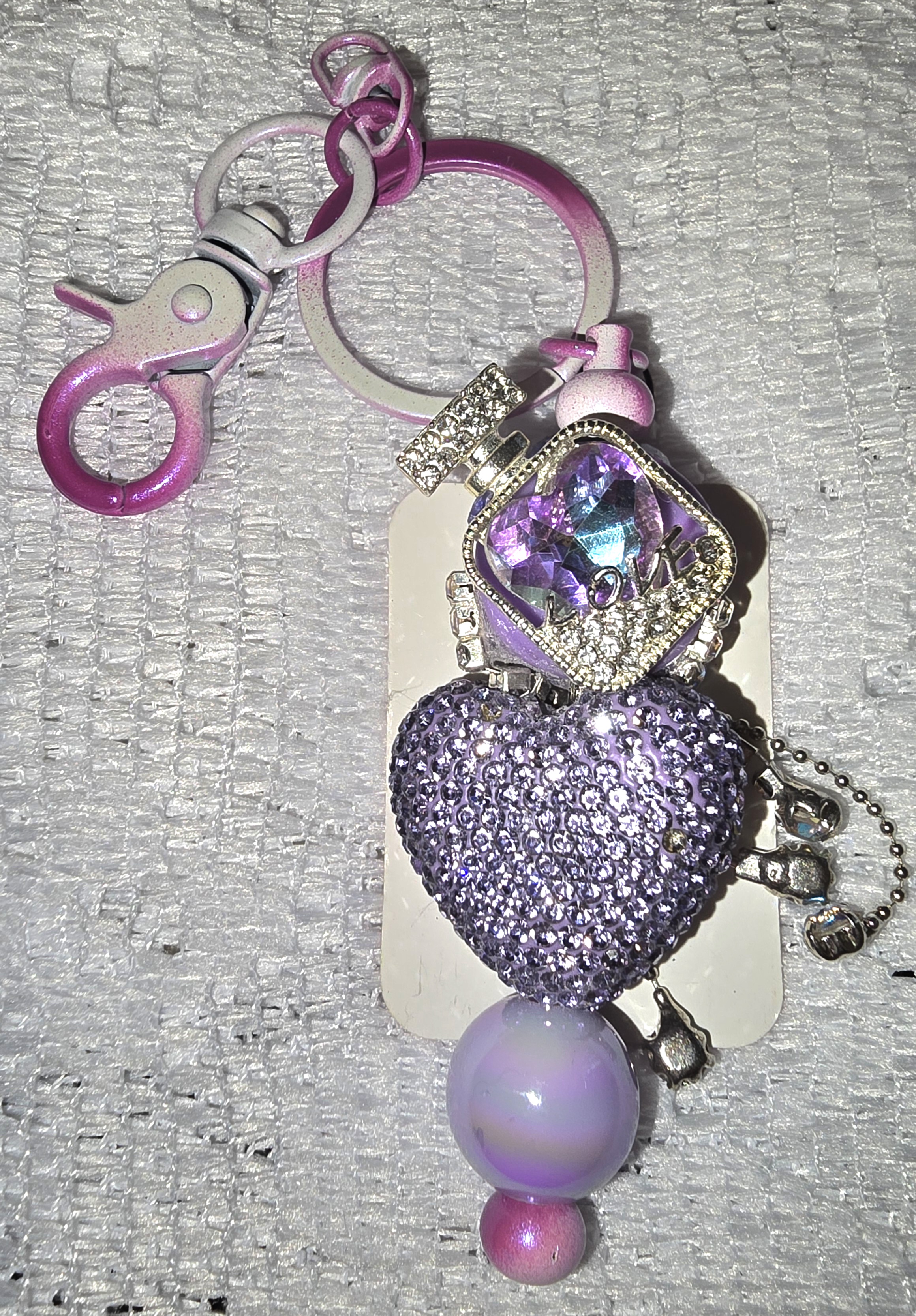 This dazzling accessory is a celebration of love and luxe whimsy. At its heart—literally—is a radiant, rhinestone-encrusted purple heart that catches the light with every movement. Above it, a square-cut crystal CC perfume bottle bears the word “LOVE,” like a whispered promise. Below, two beads—one iridescent violet, the other soft pink—add playful dimension and charm. The pink clasp and ring offer a sweet contrast, while scattered rhinestones and metallic accents complete the look with opulent flair. It’s romantic, glamorous, and unapologetically fun.