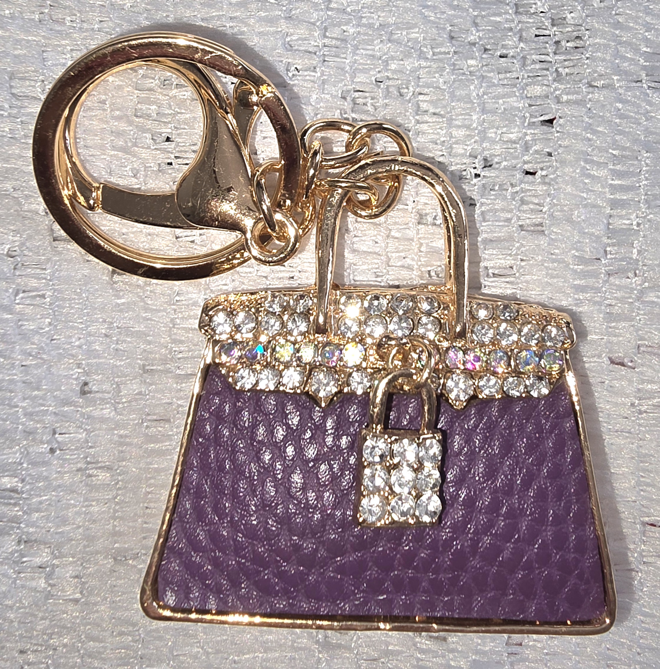 This dazzling keychain is a miniature LV handbag transformed into a statement piece. Cloaked in rich violet faux leather with a pebbled texture, it evokes the elegance of a couture clutch. The top edge glistens with a cascade of rhinestones, like a jeweled tiara crowning the bag. At its heart, a crystal-encrusted padlock charm adds a touch of opulence and mystery—suggesting secrets only the stylish may unlock. The gold-toned hardware, including a lobster clasp and keyring, completes the look with a luxe finish, making it perfect for adorning your keys, tote, or backpack.