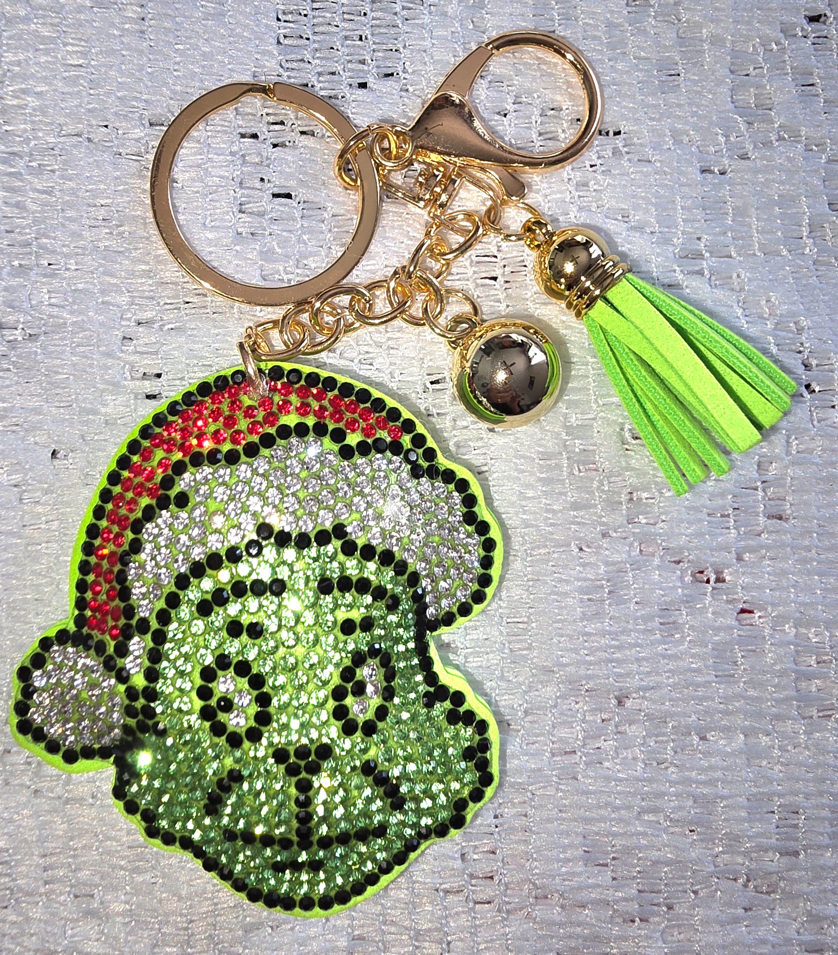 This festive keychain is a dazzling tribute to holiday mischief and sparkle. At its heart is a rhinestone-encrusted Grinch face, complete with a sly smirk and a glittering Santa hat rendered in red, white, green, and black crystals. The charm is bold and playful, capturing the iconic character’s mischievous charm with luxe flair. A gold-toned chain links the components, including a vivid green tassel capped in gold and a metallic orb that adds a touch of jingle or shine. Altogether, it’s a cheeky, high-glam accessory perfect for adding personality to holiday bags, keys, or gift wrapping.