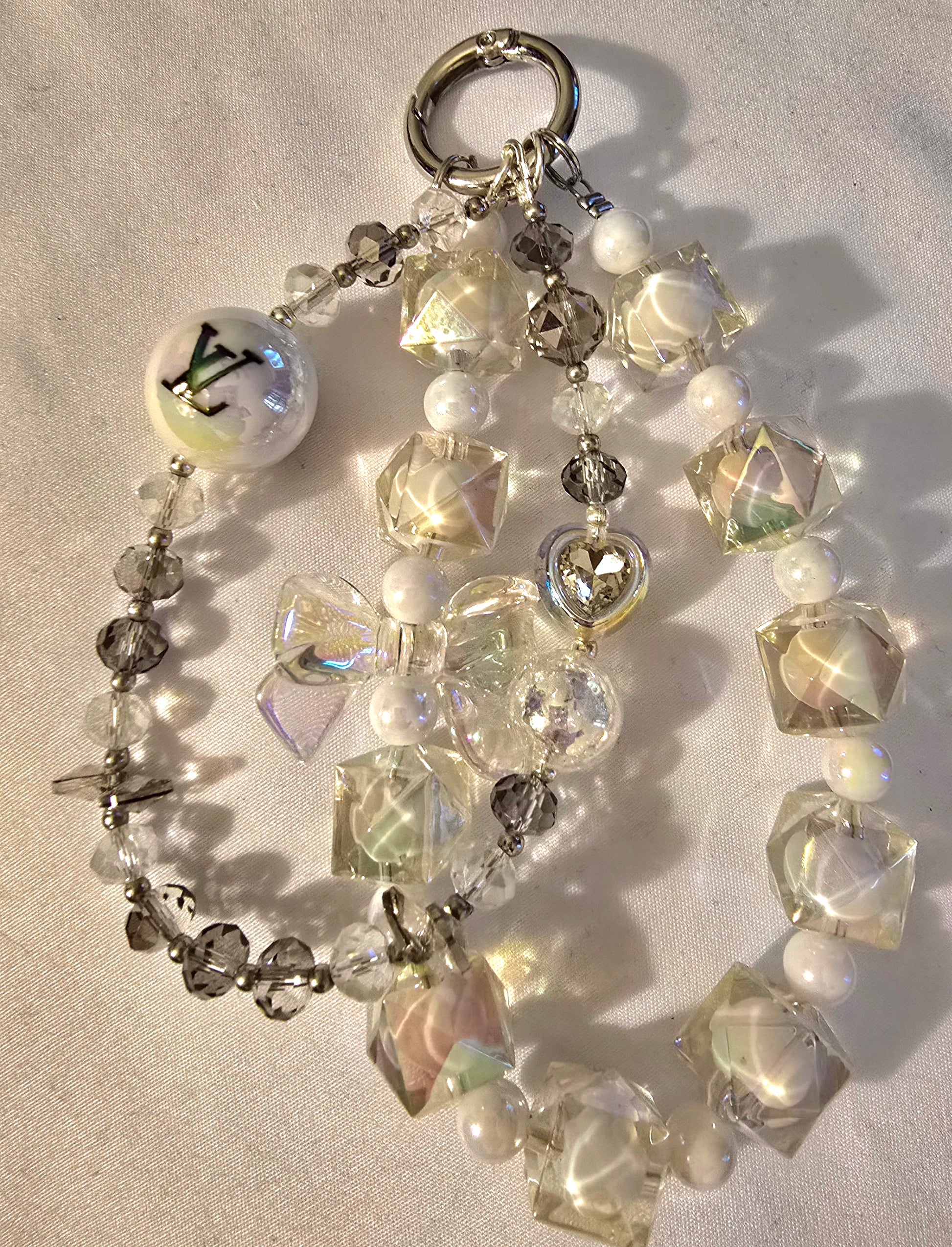 • A standout white bead with a black “LV”, hinting at branding