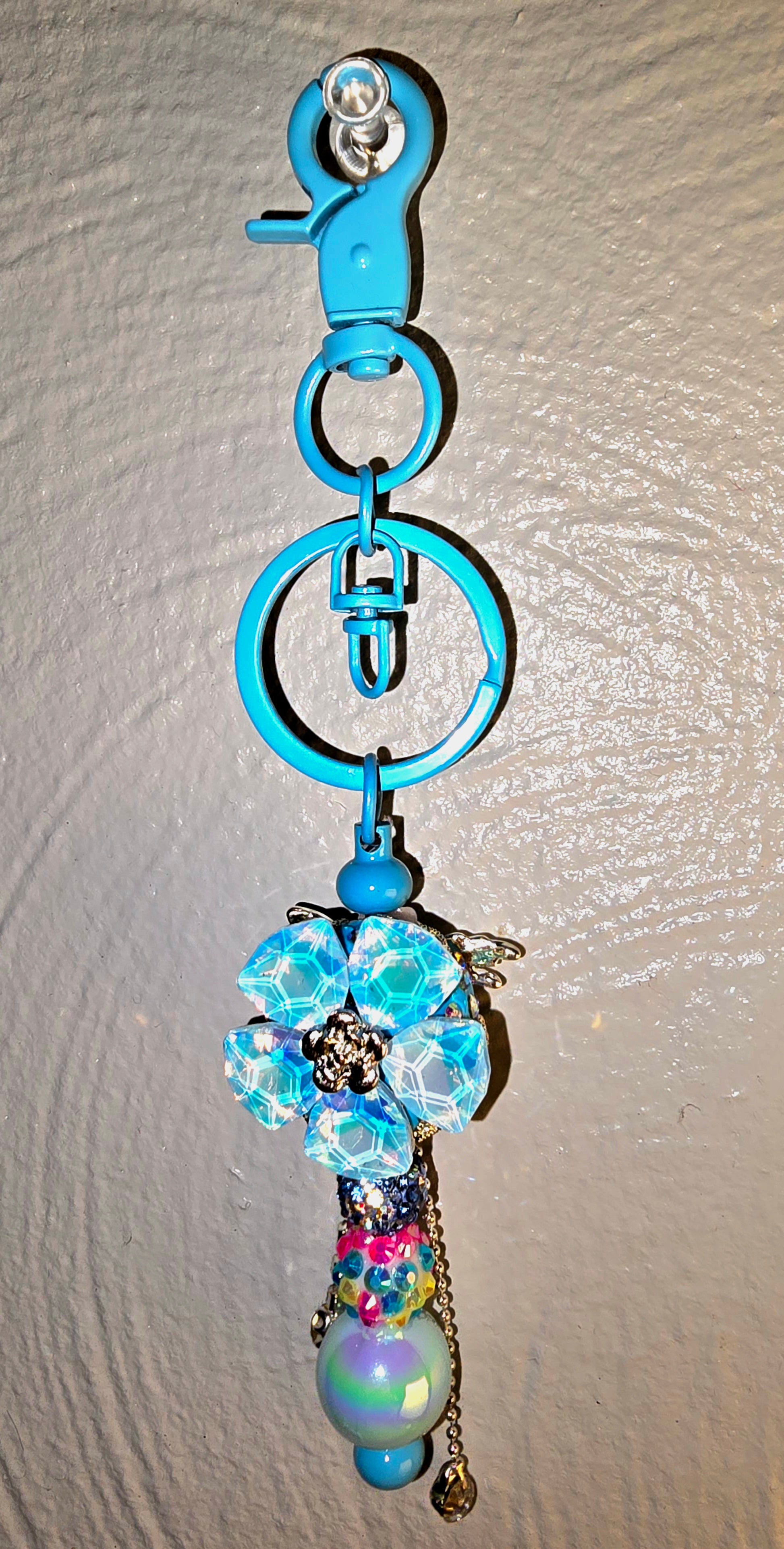 A whimsical cascade of charm and color, this keychain begins with a translucent blue clasp and interlocking rings that evoke the lightness of spring skies. At its heart blooms a stylized flower—blue and white petals encircling a rhinestone center—framed by metallic flourishes that add a touch of glamour. Below, a string of iridescent beads dances with movement, anchored by a luminous orb and a delicate gold chain that ends in a petite charm. The palette is dreamy and aquatic, with hints of garden fantasy and celestial shimmer.