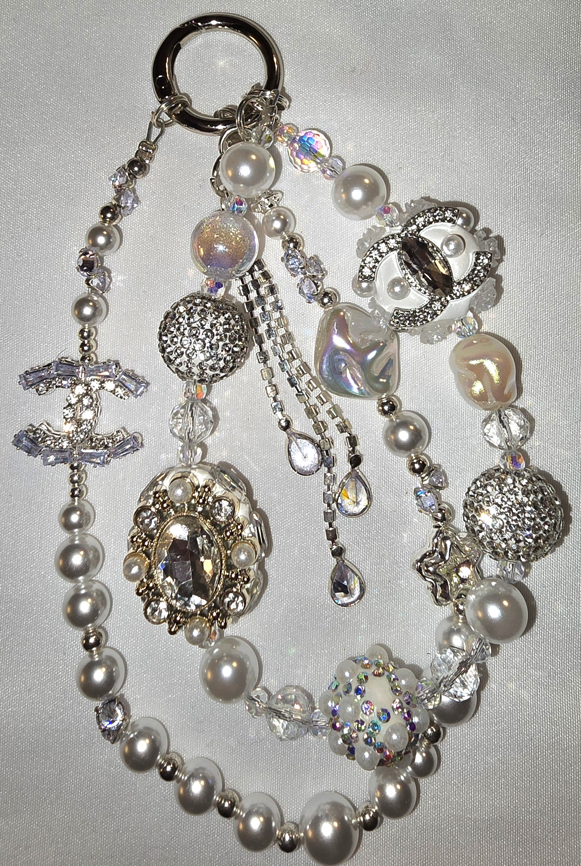This accessory is a dazzling celebration of opulence and whimsy. A cascade of faux pearls, rhinestones, and metallic beads forms the foundation, while the charms—each one a miniature treasure—evoke a romantic, fairytale elegance. There's a crystal-studded bow, a heart with iridescent shimmer, and floral motifs that glisten like dew-kissed petals. The overall composition feels like a curated charm garden, suspended from a sleek metallic ring that anchors the piece with polish and sophistication. It’s both playful and regal—perfect for someone who loves their accessories to tell a story.