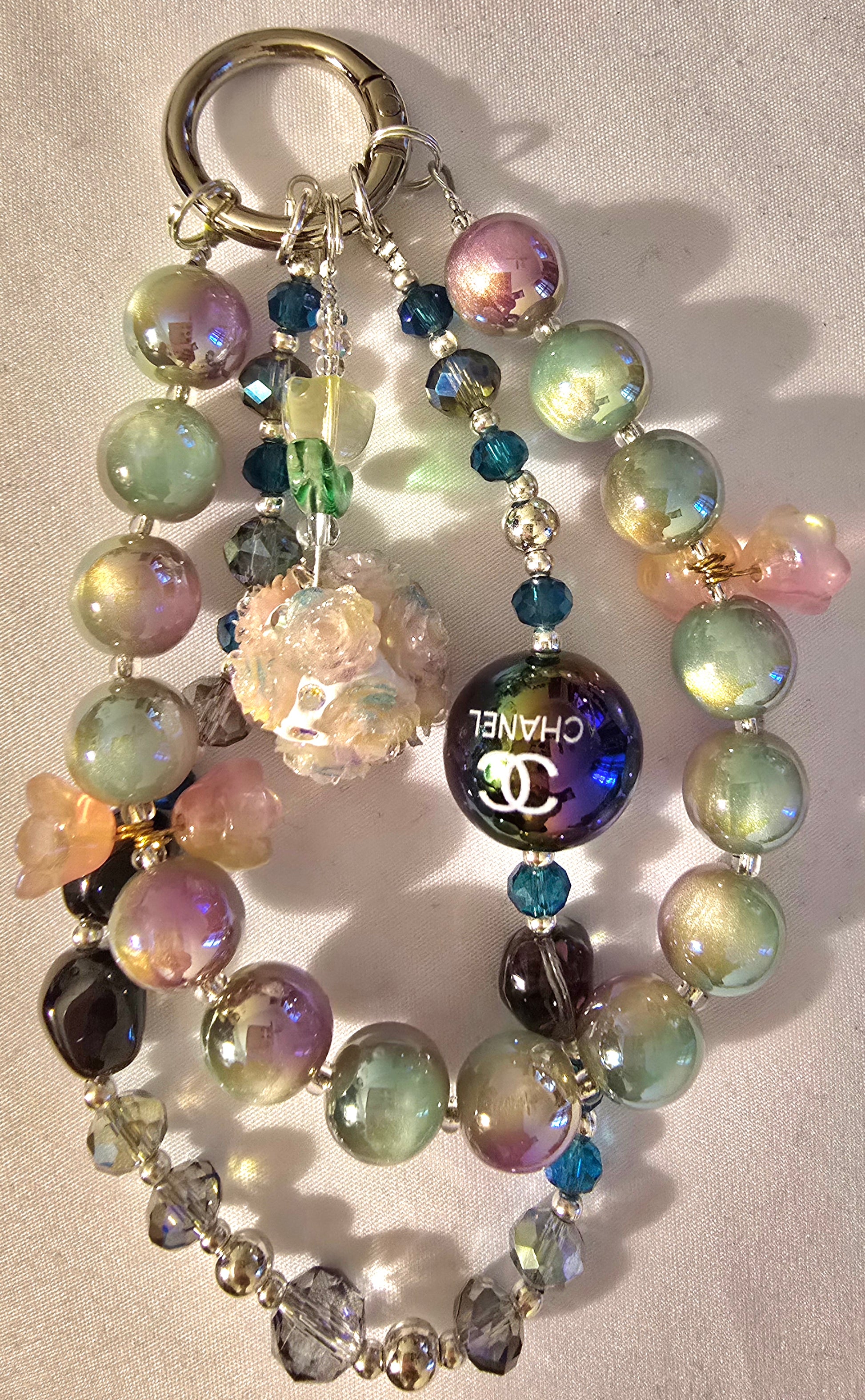 This piece is a dazzling, multi-strand accessory that dances between bag charm and luxe keychain. It features a kaleidoscope of beads—iridescent pastels, faceted crystals, and metallic accents—all anchored by a bold, dark purple bead emblazoned with the iconic CC logo. Floral-shaped beads and a central orb adorned with tiny blossoms add a whimsical, garden-party elegance. The strands converge at a polished metallic ring, making it perfect for clipping onto a designer tote or using as a statement charm.