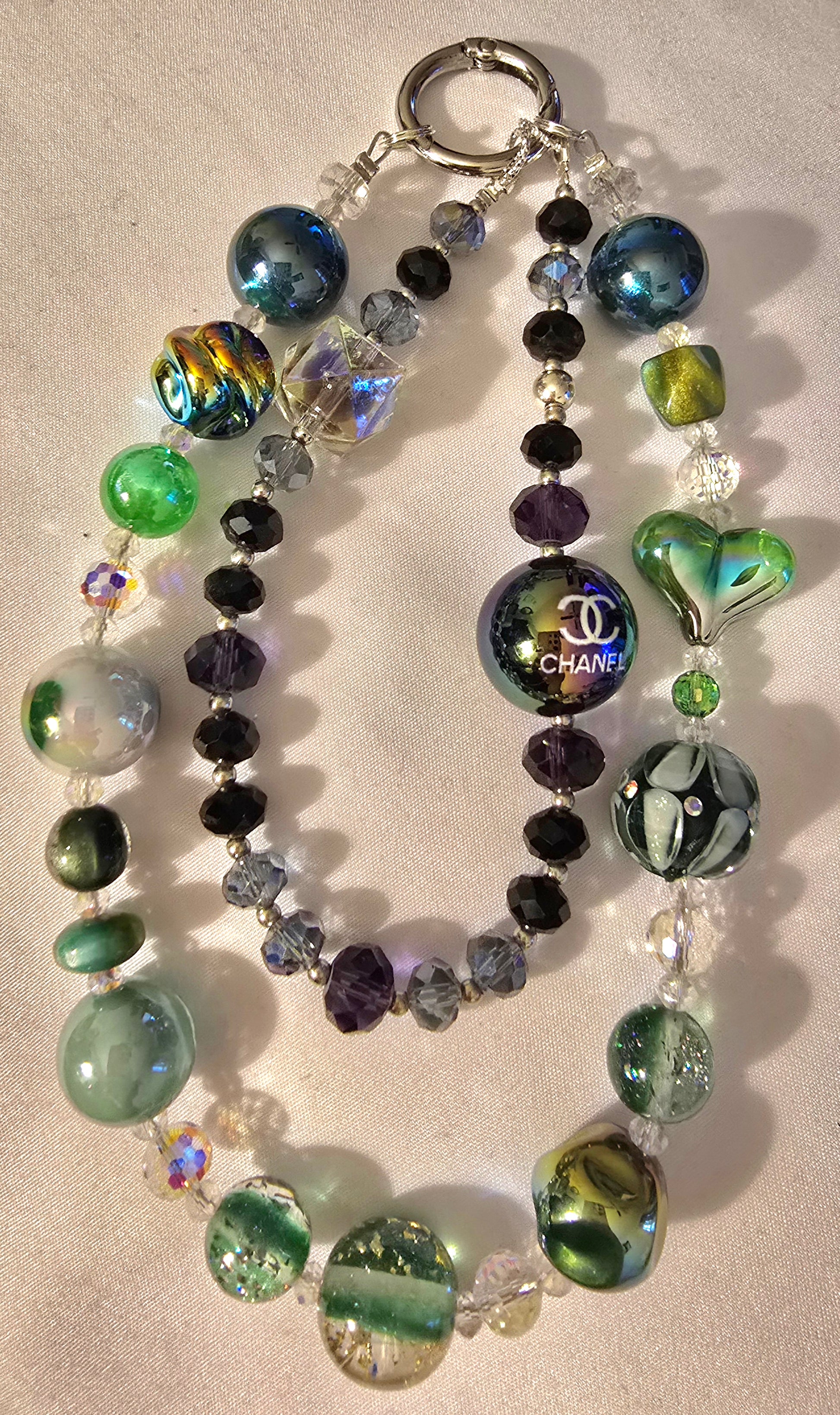 This piece is a visual symphony of eclectic elegance. Two beaded chains intertwine like twin constellations, each bead a star with its own story. The palette dances between jewel tones—emerald, amethyst, sapphire—and smoky neutrals, punctuated by iridescent glints and metallic accents. Faceted glass, smooth pearls, and sculptural shapes create a tactile rhythm, while the bold CC logo bead anchors the composition in unmistakable luxury. The oversized metallic ring clasp adds a touch of industrial chic, balancing the whimsy with edge.