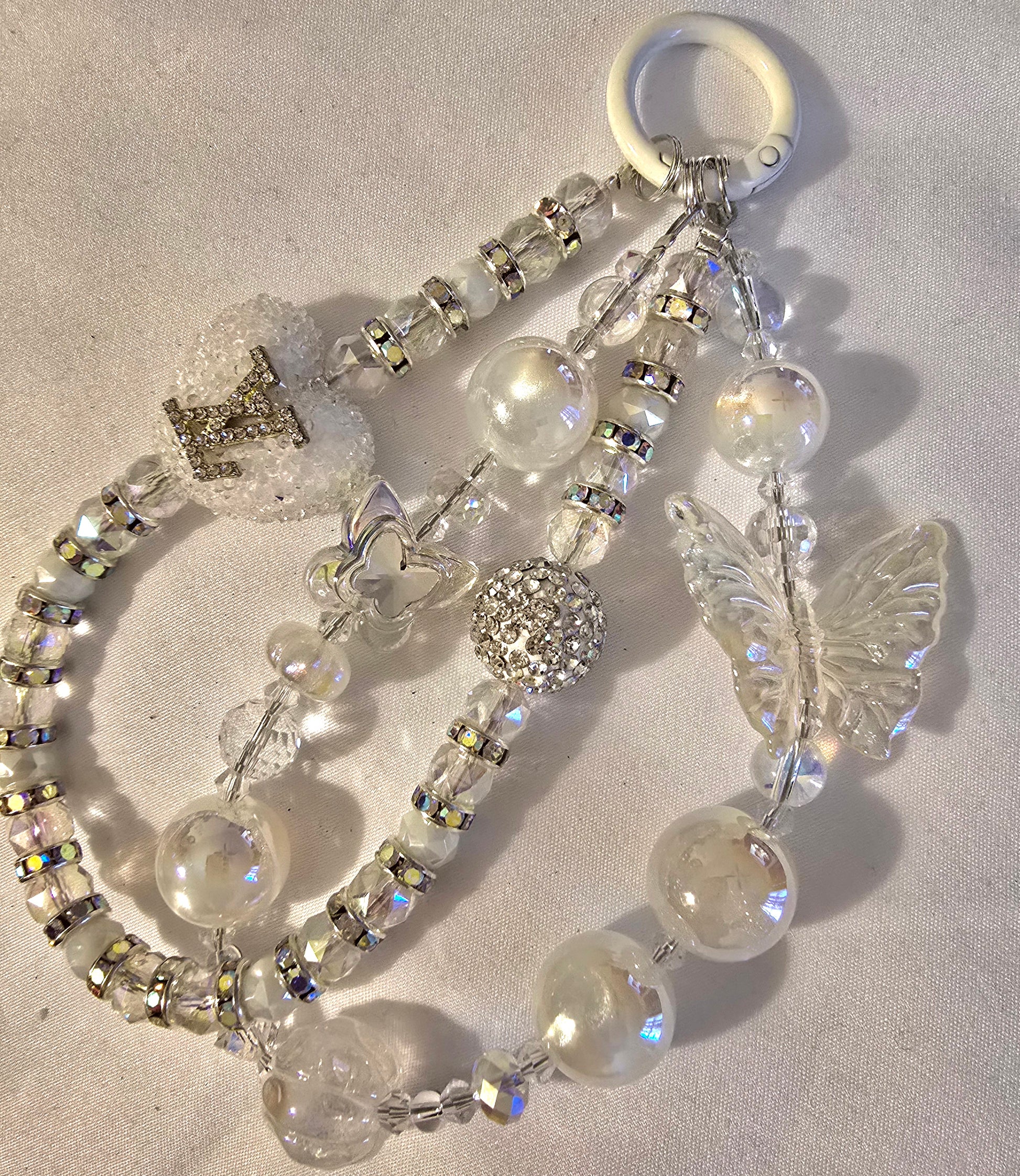 This charm is a dazzling cascade of elegance and whimsy. It features a dreamy mix of textures and finishes—clear faceted beads that catch the light like dew drops, pearlescent orbs that evoke moonlit glamour, and a rhinestone-encrusted sphere that adds a touch of starry opulence. The centerpiece is a large, translucent butterfly, poised mid-flight and a white heart LV charm, lending a sense of movement and fantasy. A white textured bead crowned with a silver tiara adds regal flair, while the circular white ring at the top anchors the piece with clean simplicity.