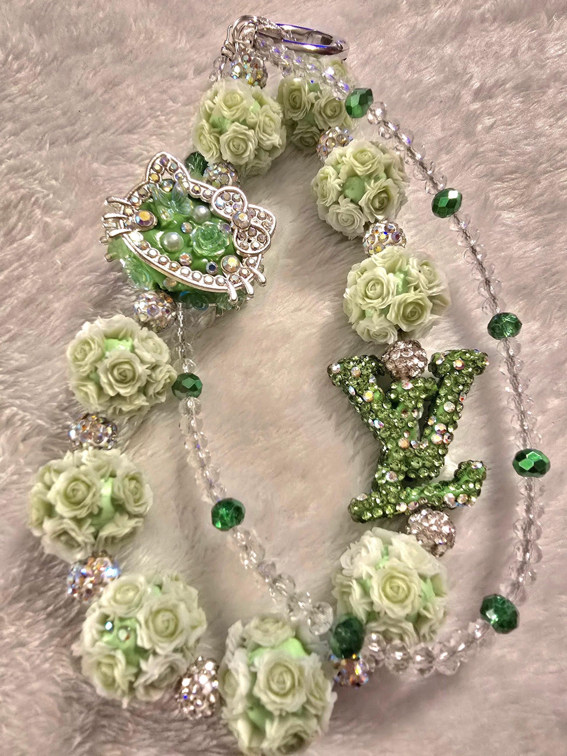 - 💚 LV logo charm also rhinestone-studded, giving it that unmistakable high-fashion edge