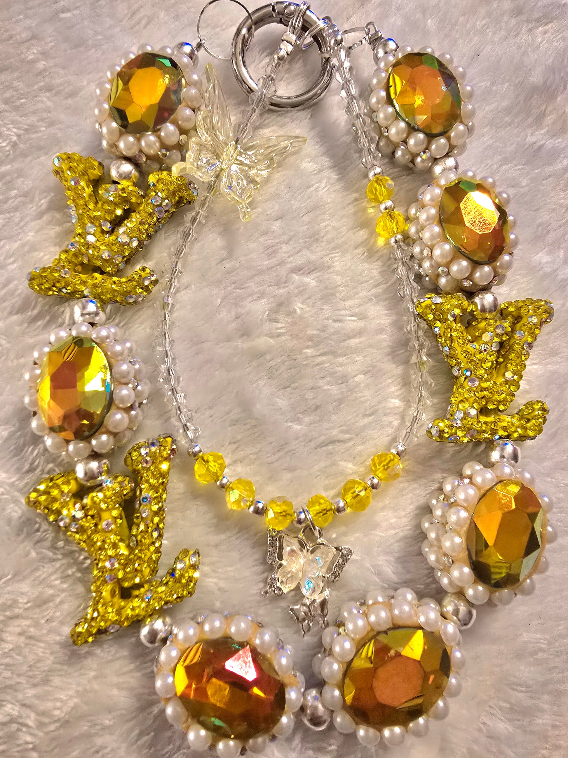 - Beaded Details: Clear and yellow beads interspersed throughout the chain create movement and sparkle.