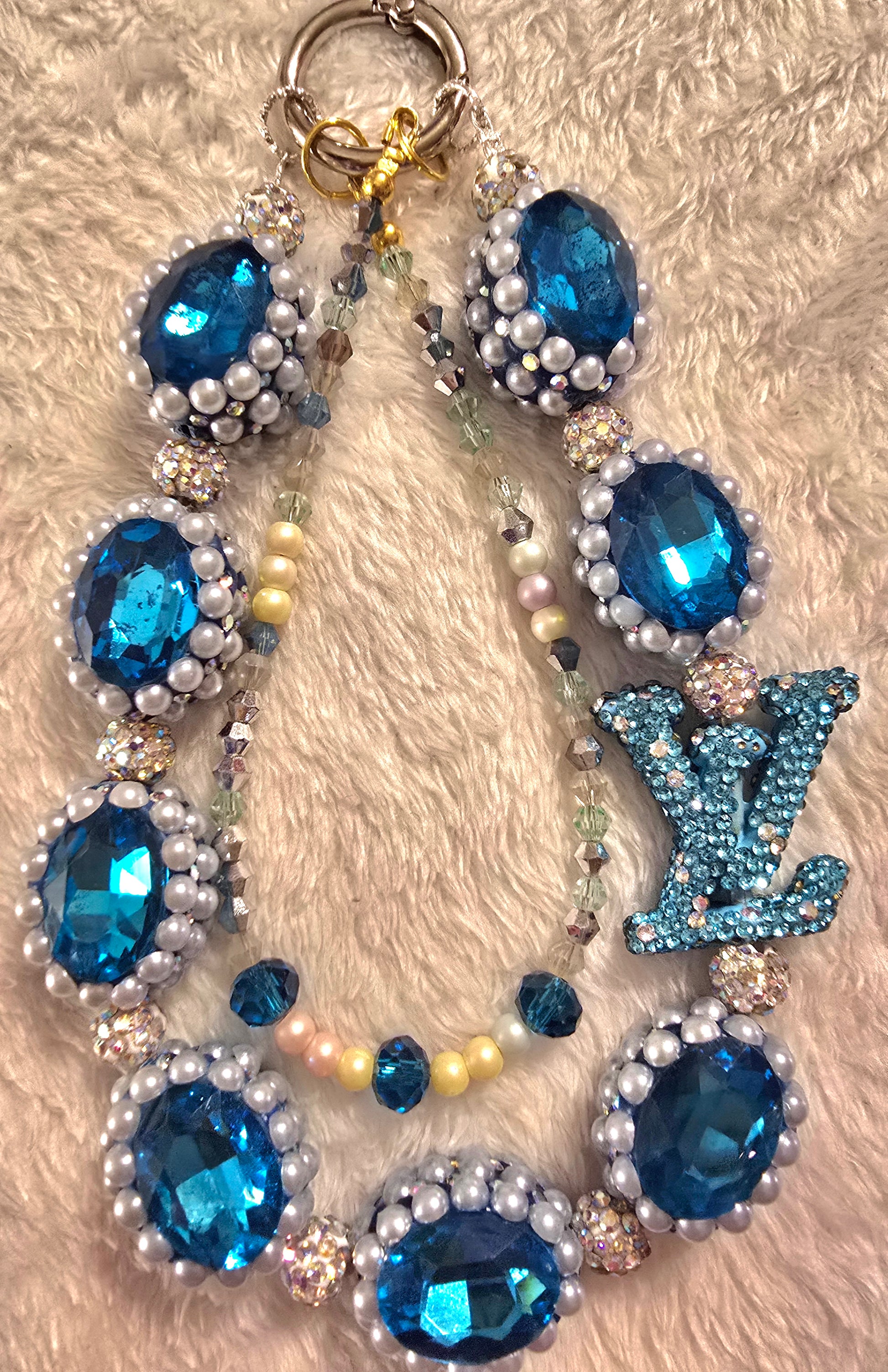 - Centerpiece: A radiant "LV" logo encrusted with shimmering blue rhinestones, unmistakably designer, anchors the design with luxury appeal.