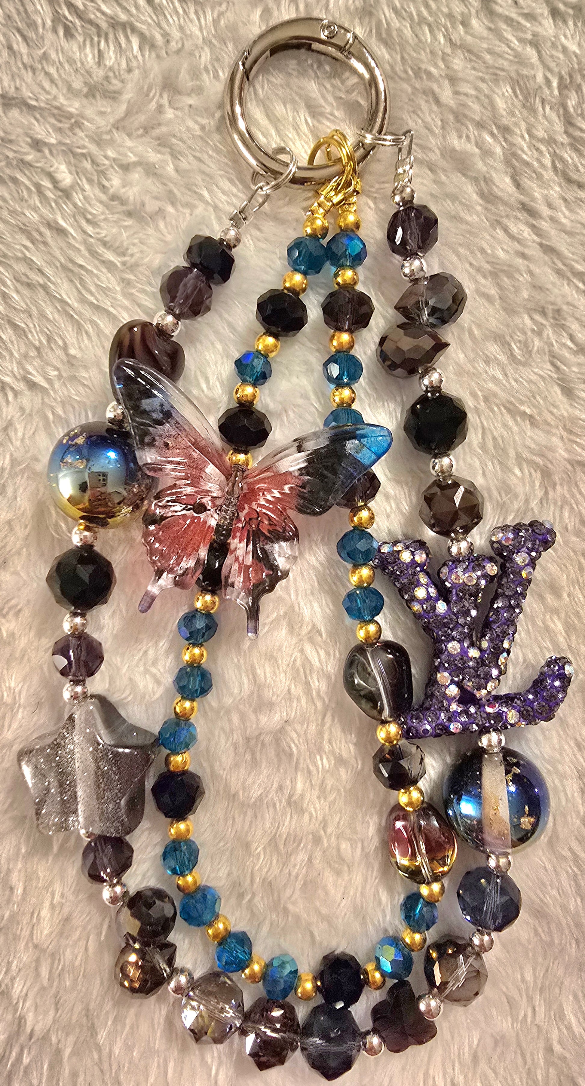 - Statement charms like a rhinestone-encrusted purple “LV” logo, a pink-and-black butterfly, and a silver star for playful elegance