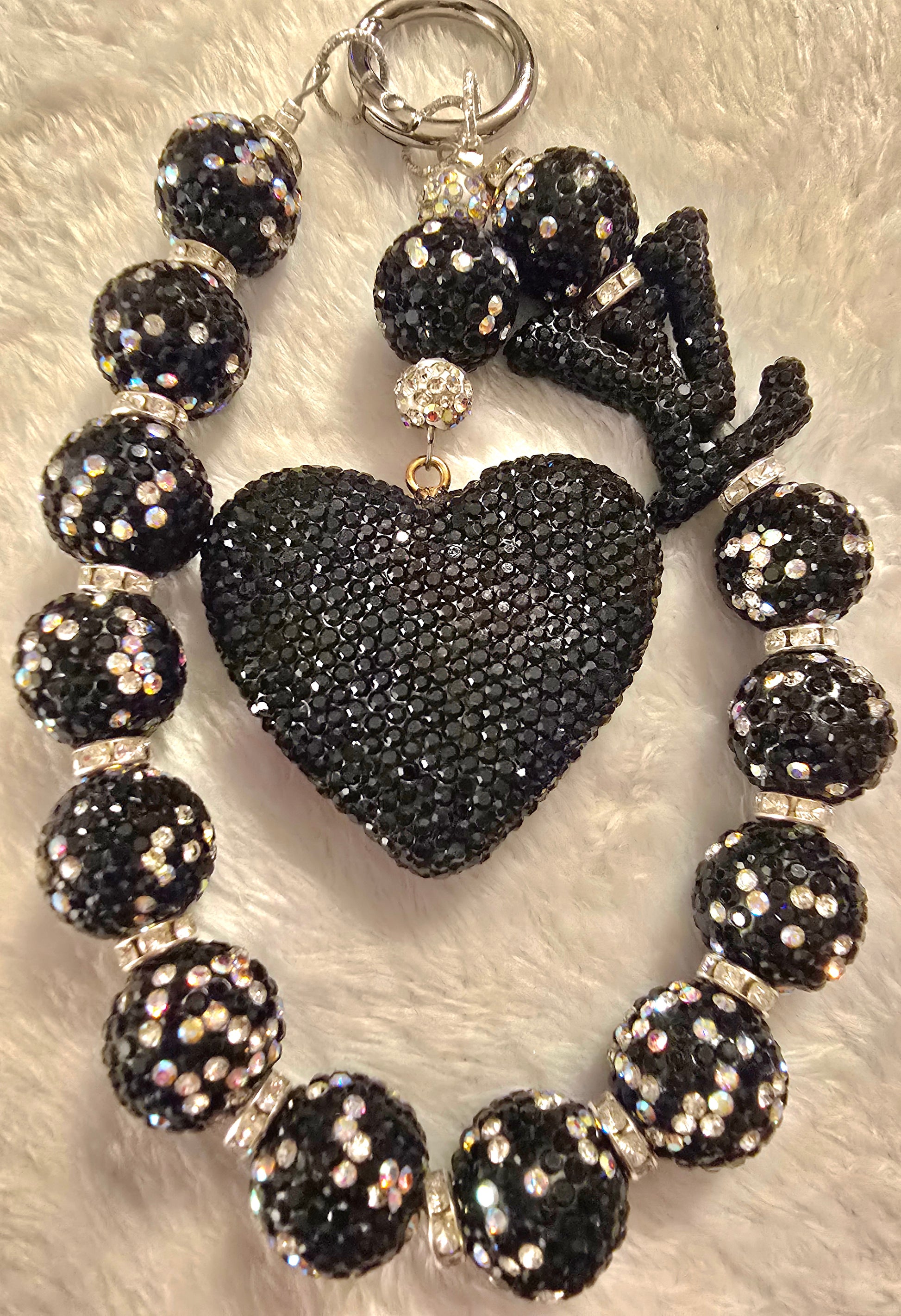 ✨ This designer accessory chain is a bold fusion of elegance and edge. It features glossy black beads interspersed with shimmering rhinestones, creating a luxe contrast that catches the light beautifully. The standout element is a large heart-shaped pendant encrusted in black rhinestones—dramatic yet refined. Dangling beside it is a sleek “LV” charm, nodding to the designer's iconic branding and adding a touch of high-fashion prestige.