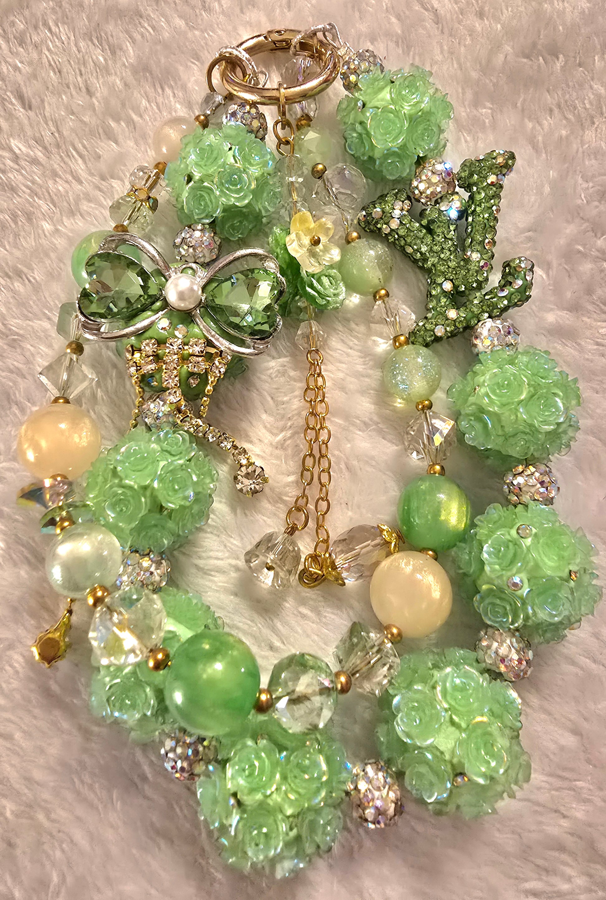 - Green and white beads with delicate rose motifs that add a romantic touch