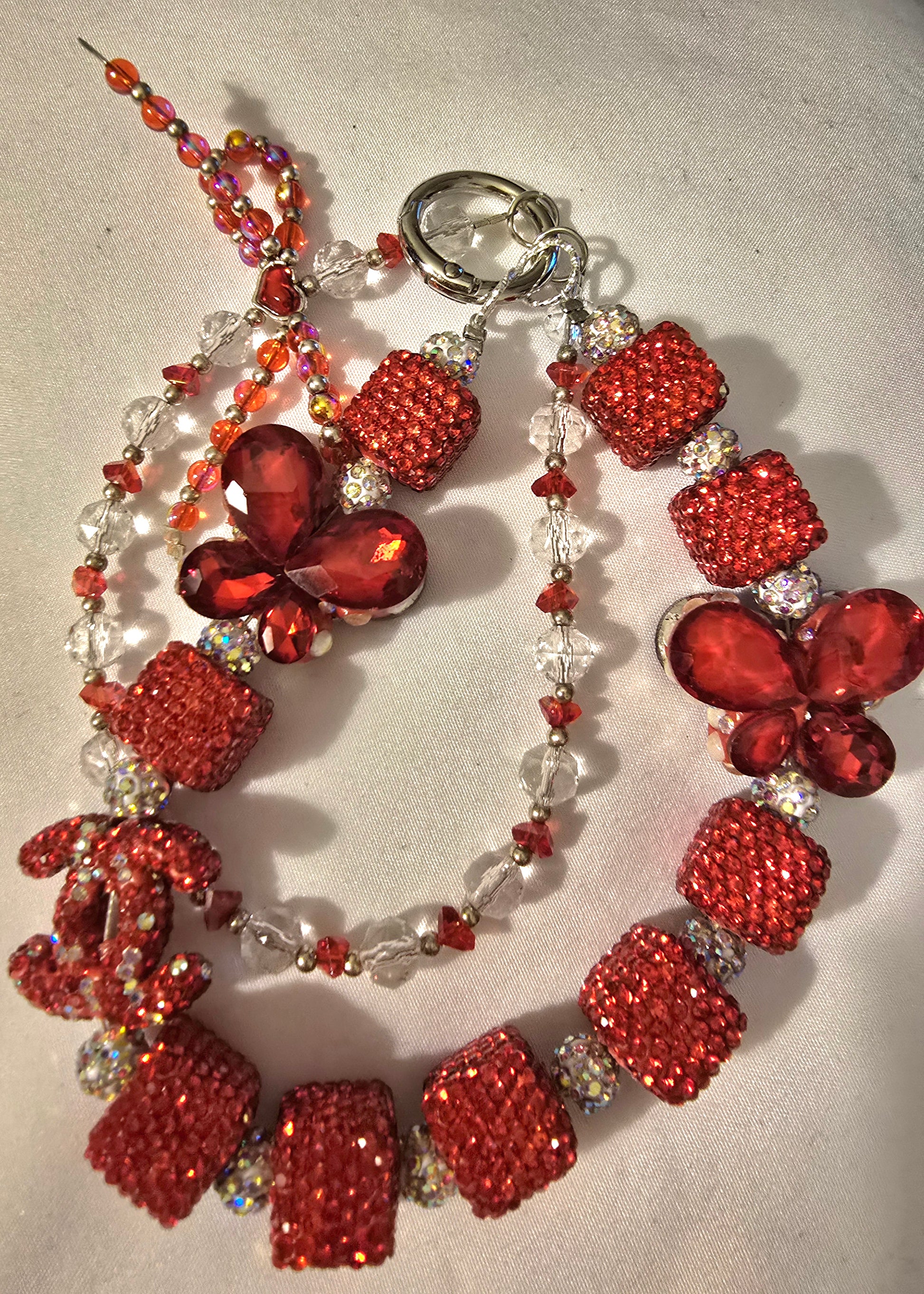 This eye-catching handcrafted chain includes a shimmering chain designed to make a bold statement. The chain features a mix of red rhinestone-studded beads, clear crystals, and dainty butterfly charms, creating a look that’s both luxurious and playful. Its companion piece, a smaller chic chain, showcases the same vibrant red hues with sparkling accents and a dazzling double-C logo charm.