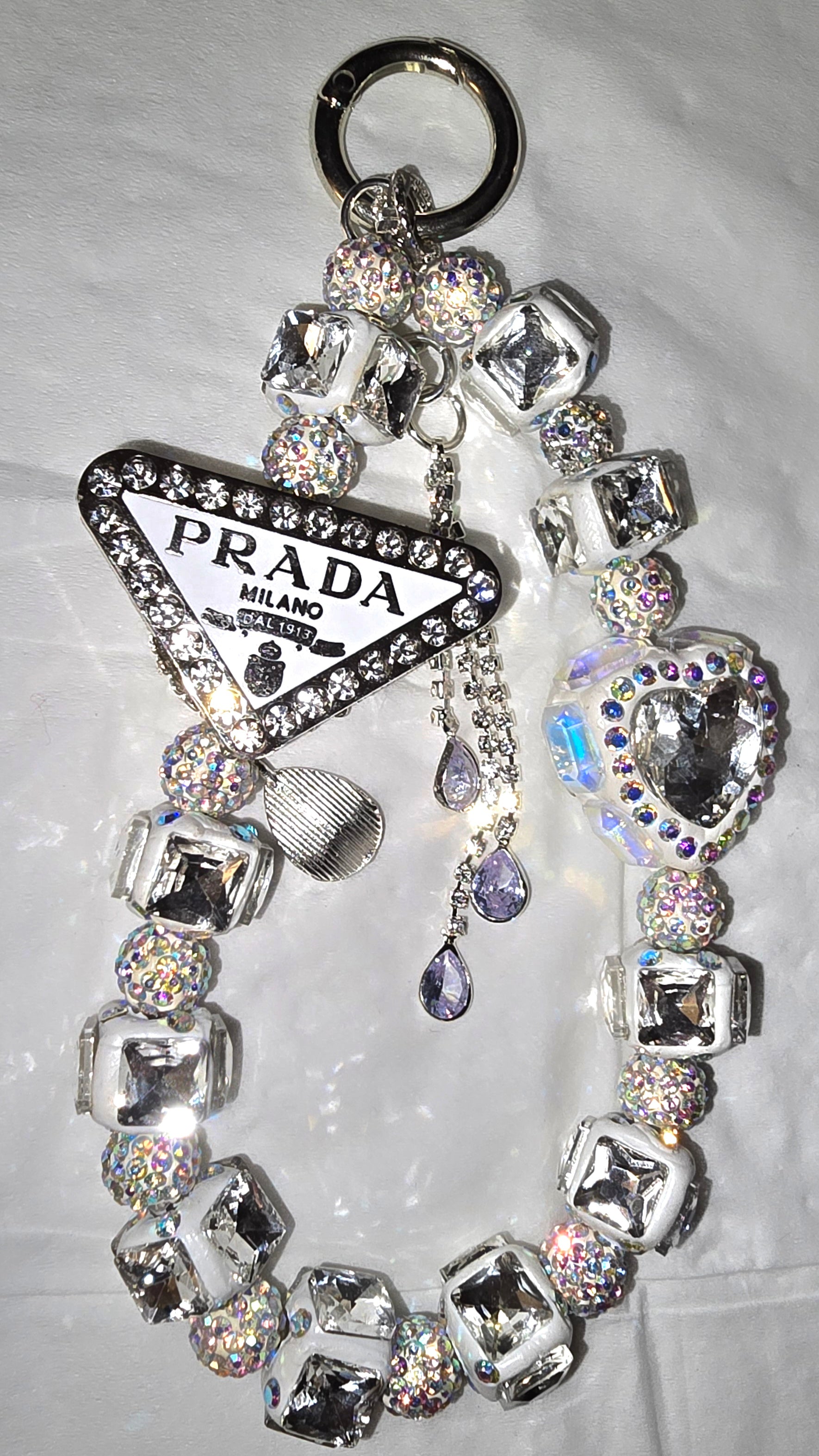 - Triangular PM Logo Charm: Embellished with rhinestones, inscribed with “PM DAL 1913” and a crest motif.