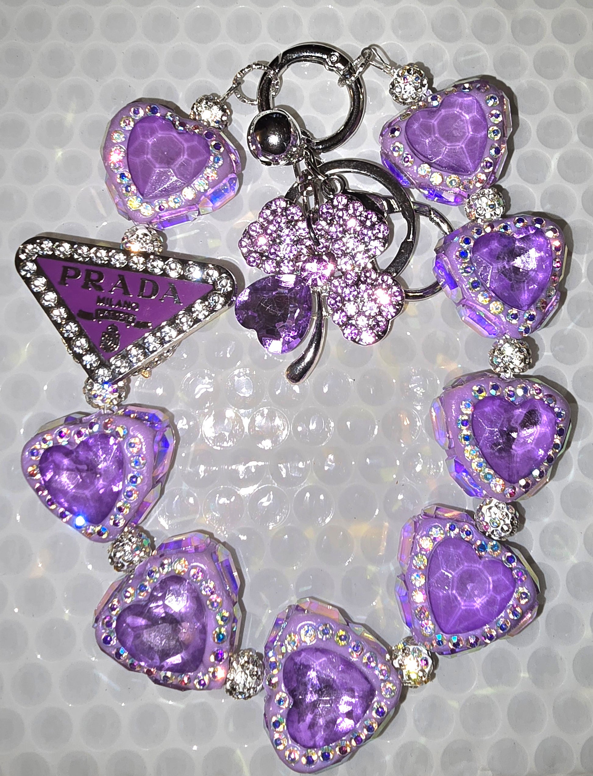 - Purple Heart Charms: Multiple heart-shaped charms in a rich violet hue, each encrusted with sparkling rhinestones that catch the light beautifully.