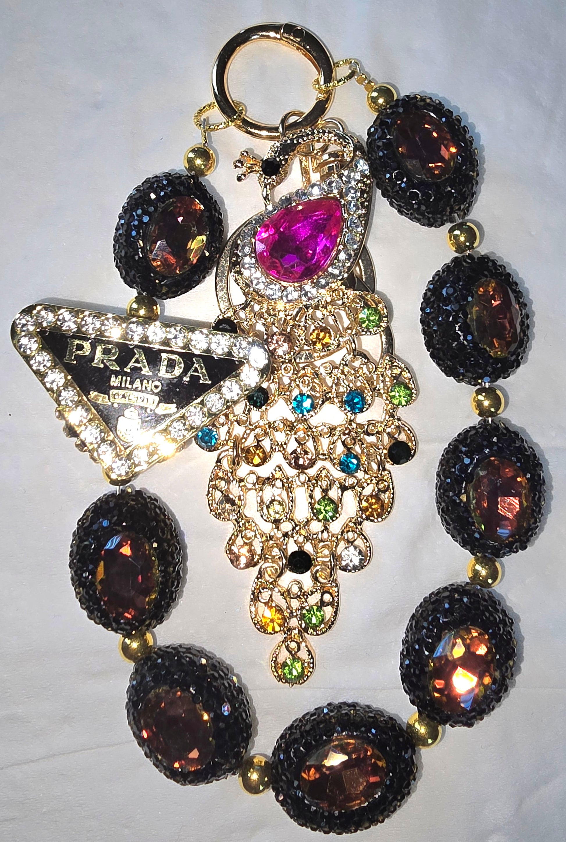 This opulent piece centers around a PM logo set in a black triangular plaque, bordered with shimmering clear stones. The chain itself is a symphony of luxury—gold links interspersed with large oval-cut gemstones, each encircled by smaller black stones for dramatic contrast. A standout feature is the peacock motif, lavishly adorned with multicolored gems, including a striking pink centerpiece that adds a whimsical yet regal flair. The overall composition blends high fashion with ornate detailing, making it a statement accessory worthy of editorial spreads or couture showcases.