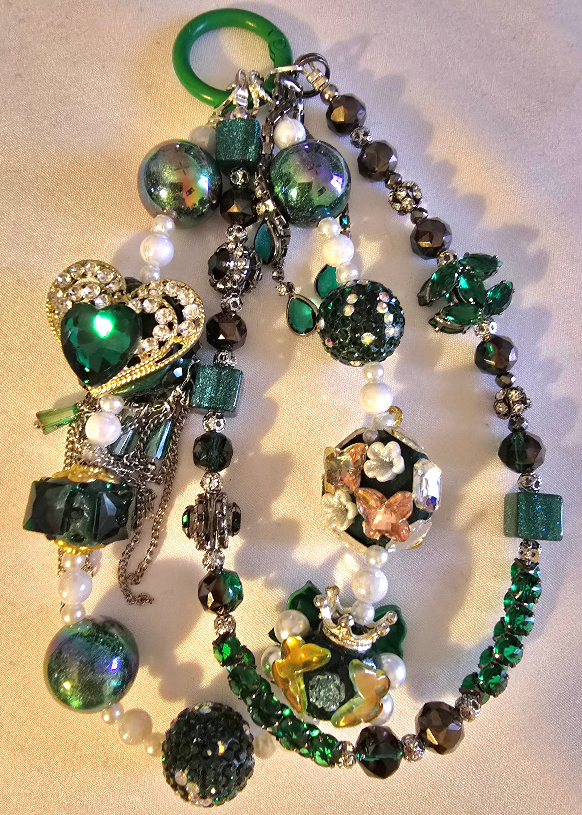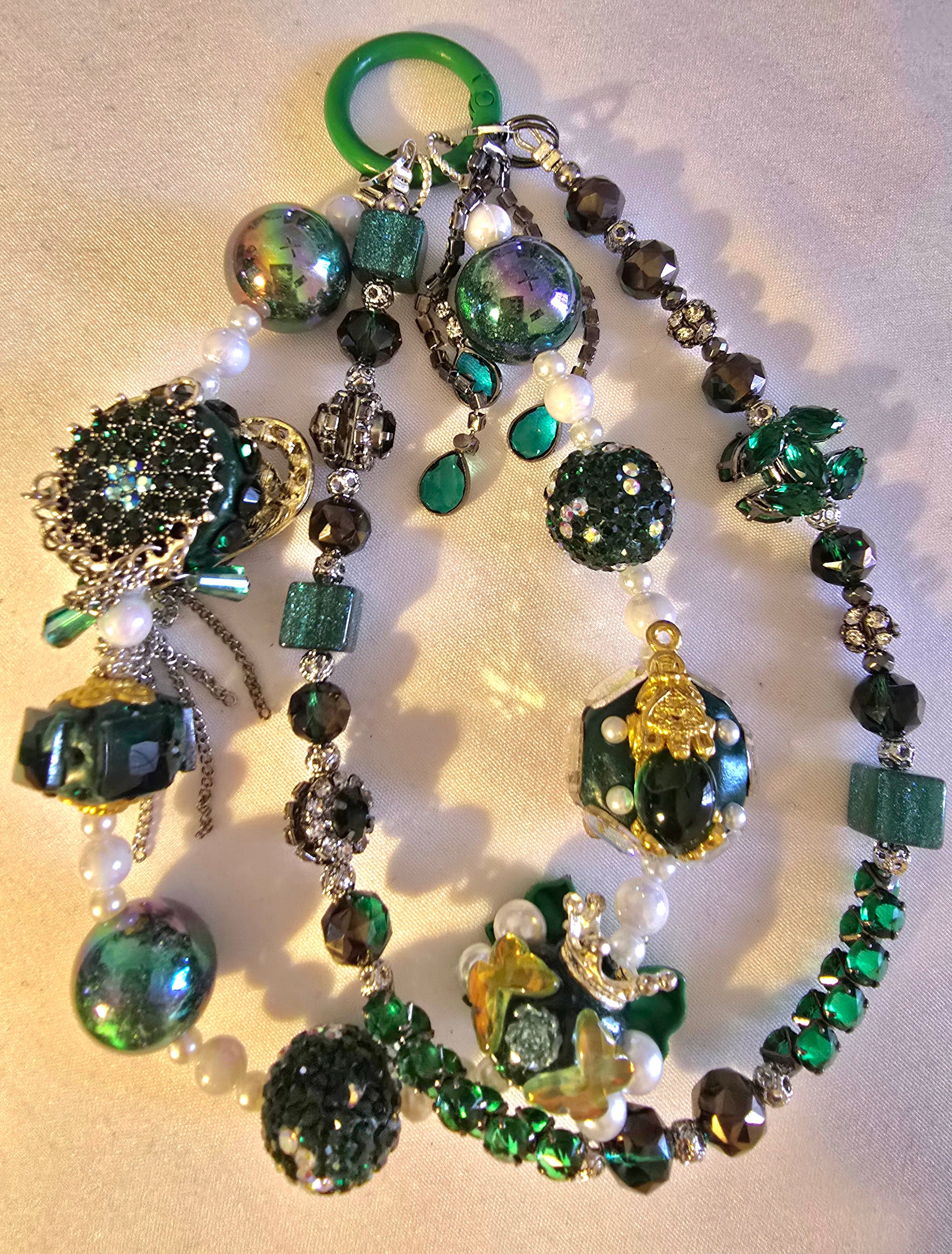 ✨ This image showcases a vibrant and ornate chain. Attached to a green ring, each piece bursts with personality and charm: