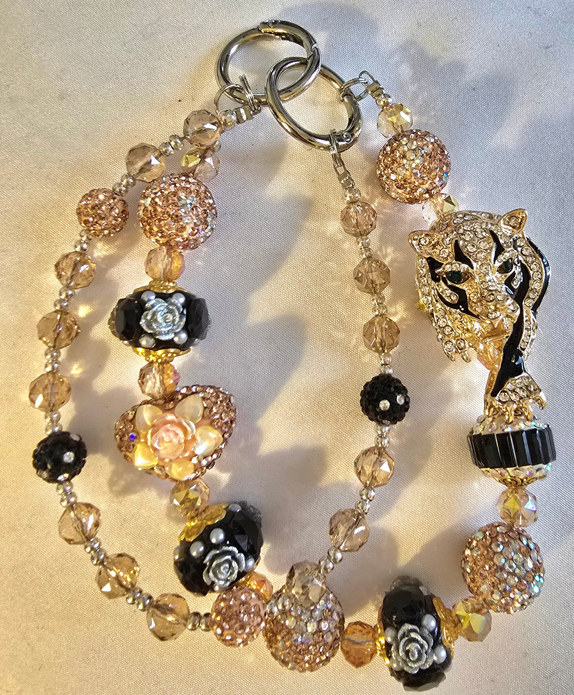 A statement accessory that prowls the line between fierce and refined. Featuring a rhinestone-studded leopard head charm surrounded by a curated mix of glossy black beads, shimmering gold accents, and delicate rose motifs, this chain is a celebration of wild elegance. Perfect for elevating handbags, keyrings, or worn as a bold phone charm.