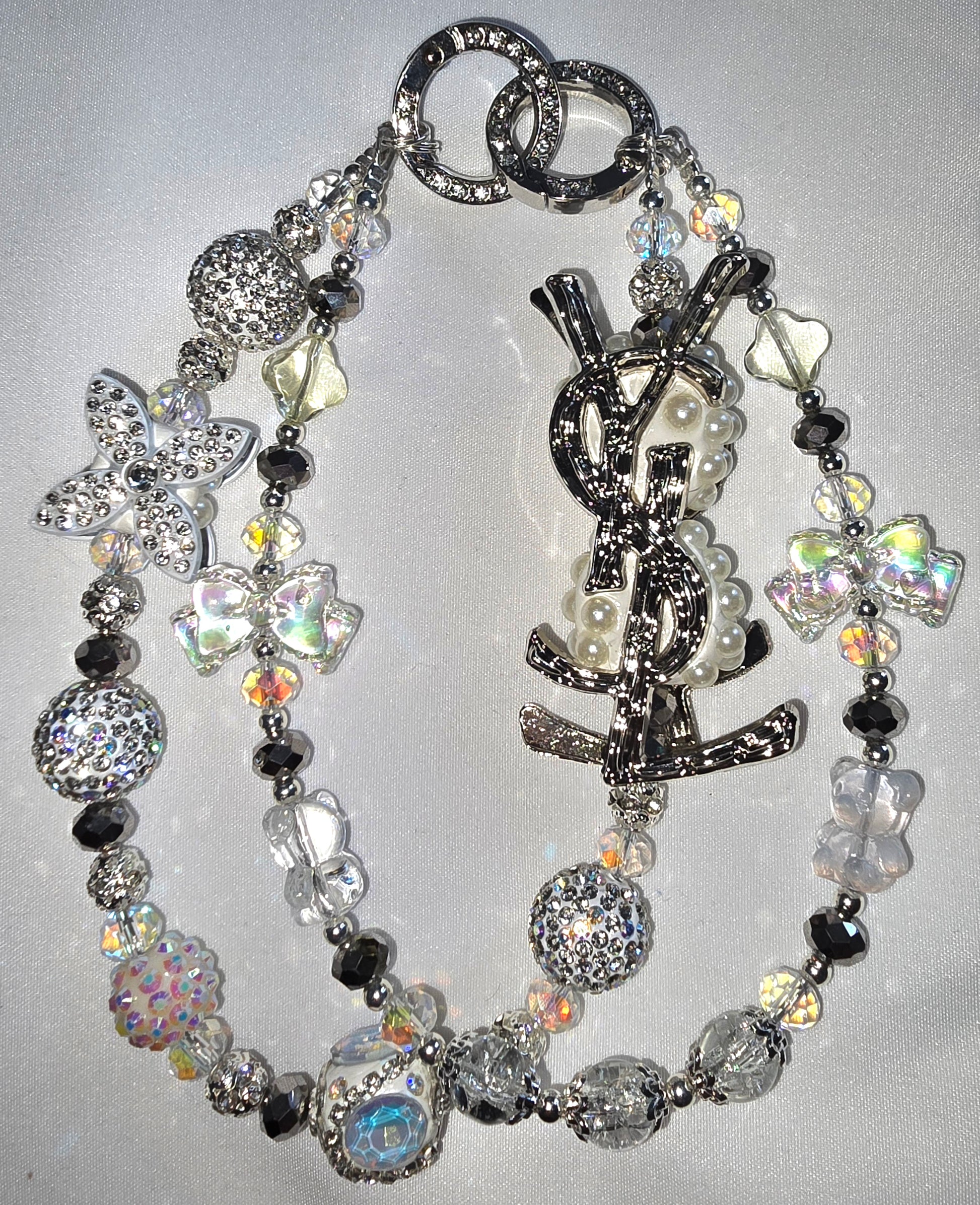 • Centerpiece: A bold, metallic YSL charm—interlocking letters in gleaming silver, anchoring the piece with unmistakable designer prestige.