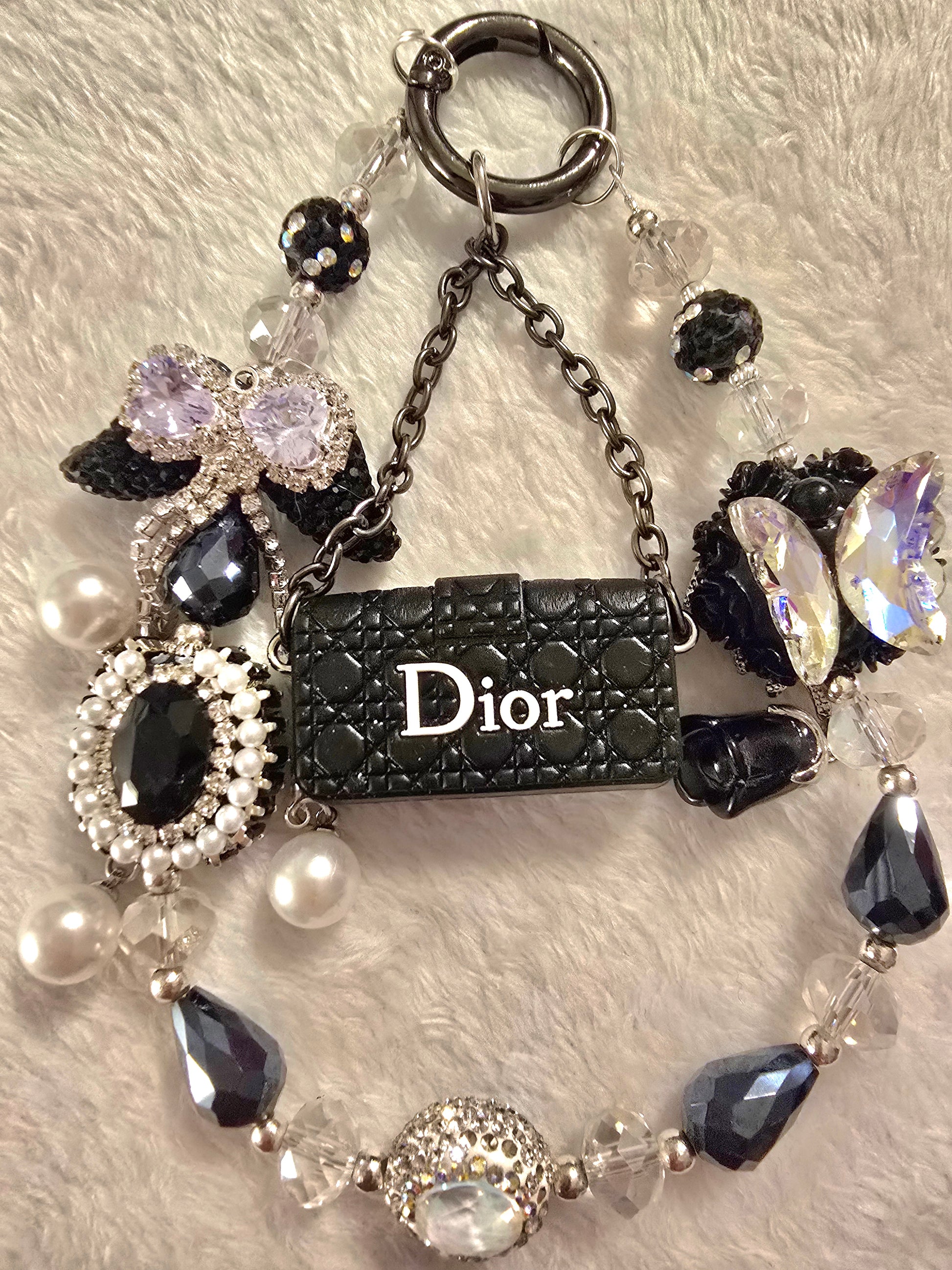 This elegant accessory features a variety of high-end decorative elements anchored by a sleek black charm with a quilted texture and the designer's name boldly printed in white. Surrounding it are a mix of eye-catching details: