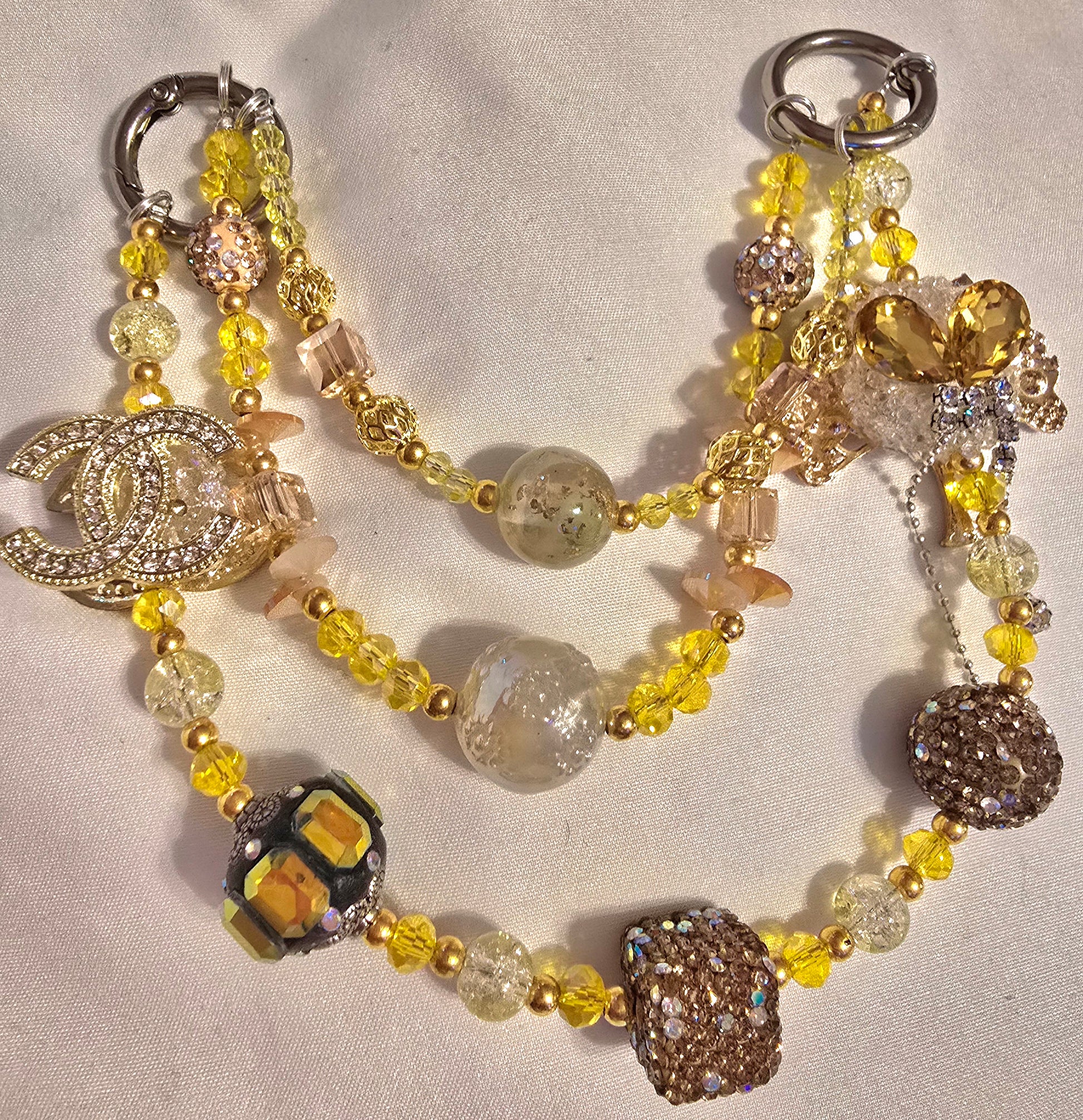 - A lively mix of beads in gold, yellow, and clear tones dominates the design.