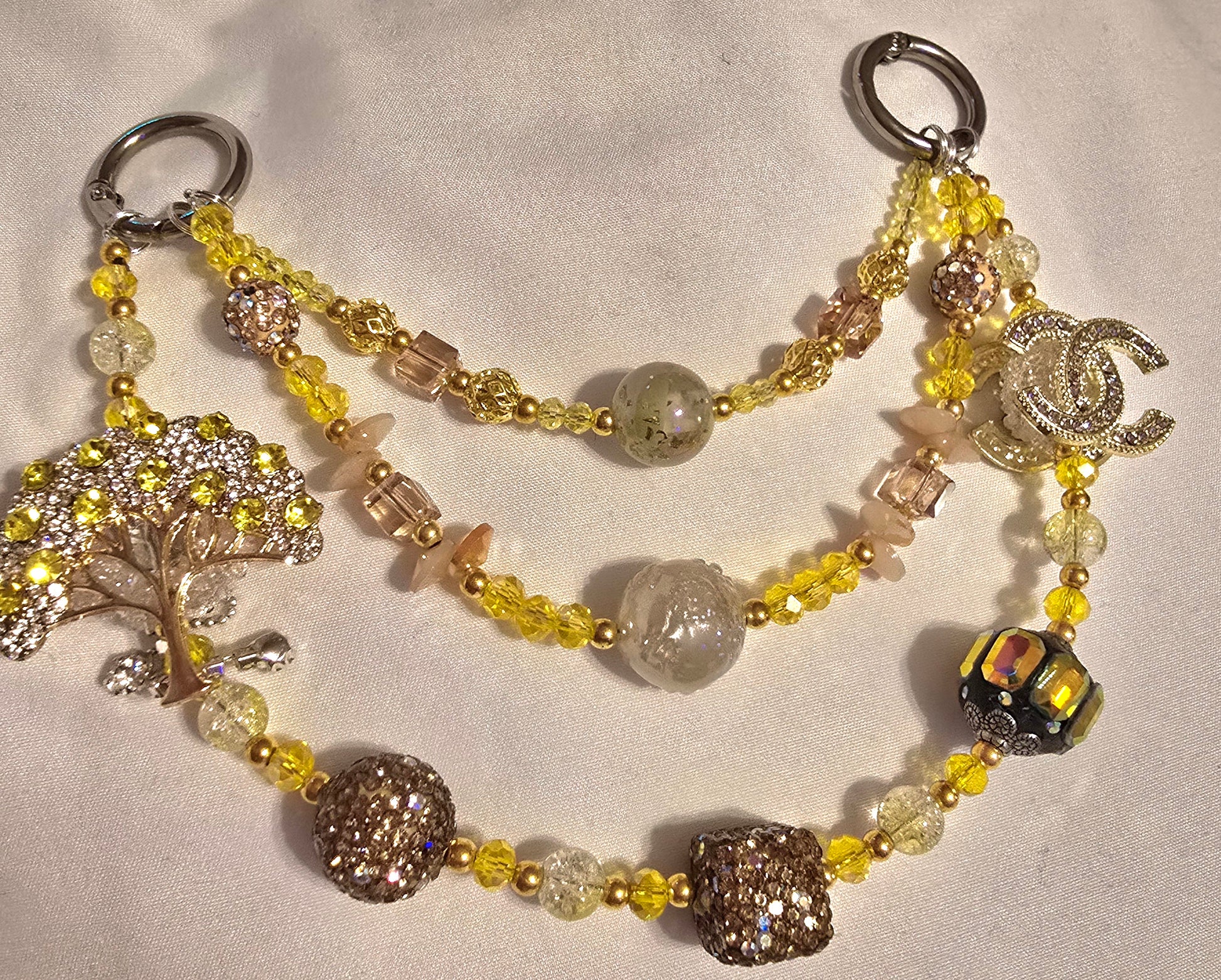 - One keychain features a shimmering tree charm embellished with yellow and clear rhinestones, symbolizing growth or nature.