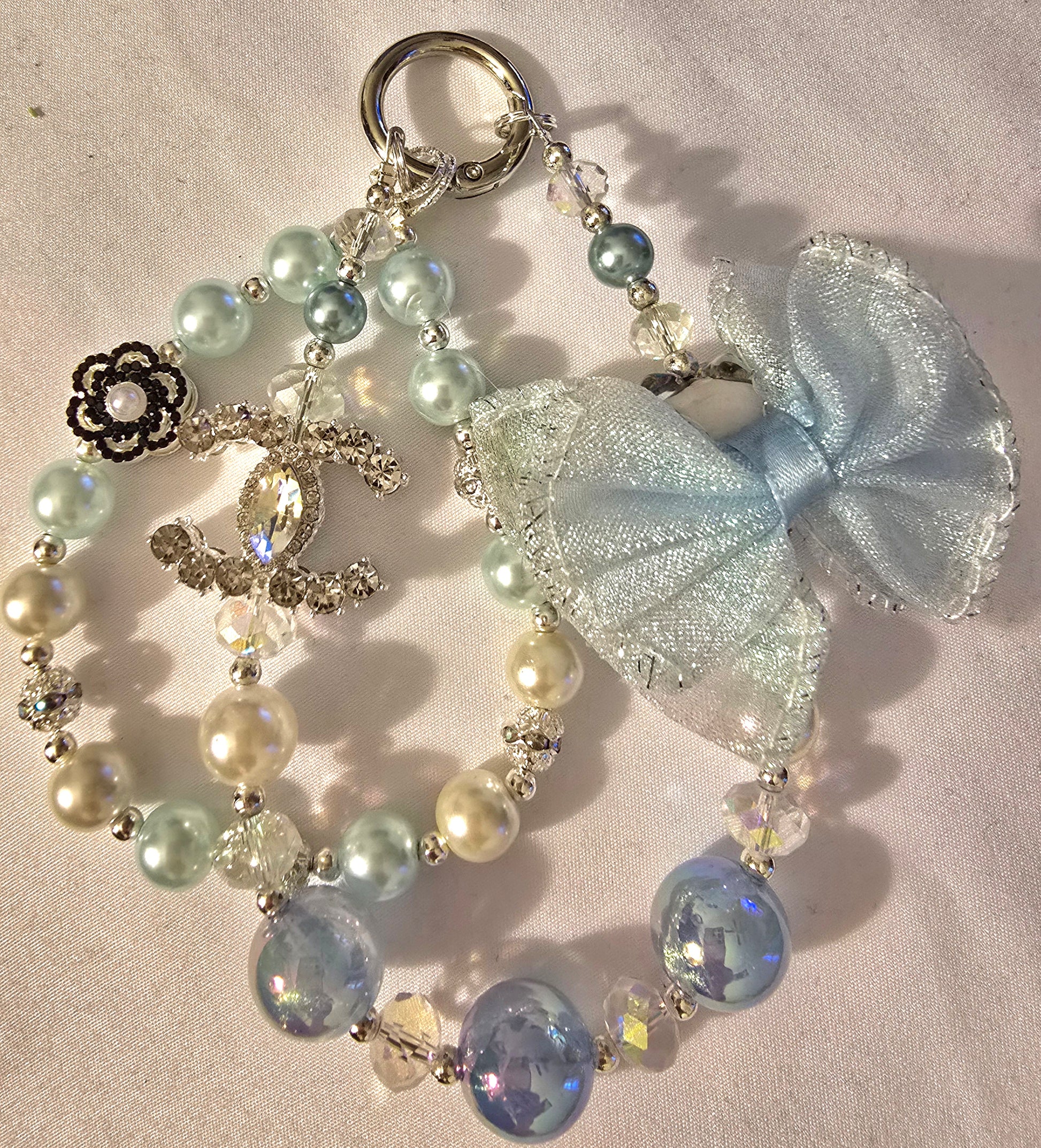 The piece is a luxurious chain adorned with a mix of charming and elegant components. It features a combination of soft blue and white pearl-like beads, shimmering clear and iridescent crystals, and refined silver accents. Among the standout details are a heart-shaped crystal with delicate winged embellishments, a dazzling rhinestone CC logo, and a lovely flower-shaped charm with a pearlescent center. The overall design feels sophisticated and stylish—ideal for someone who loves high-end, eye-catching accessories.