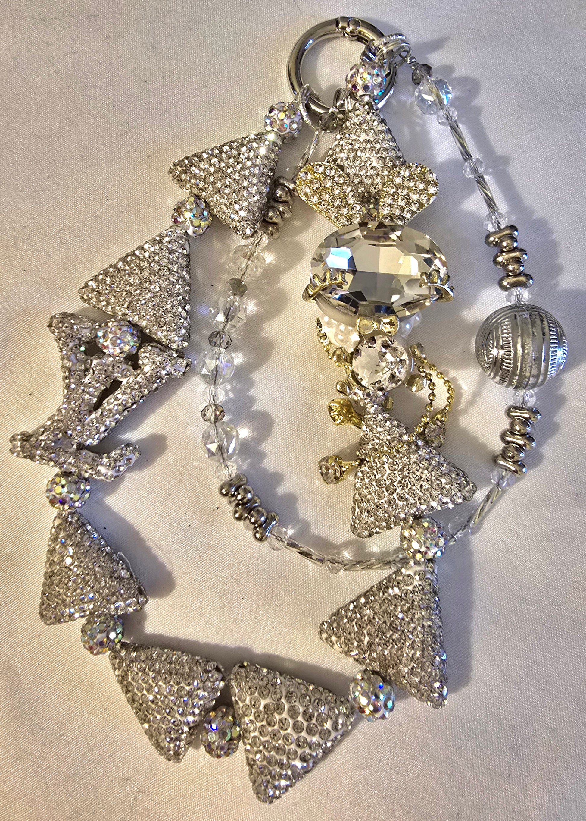 ✨ This dazzling statement piece captures the essence of luxury with its dramatic play of sparkle and geometry. Suspended from a fine metal chain are multiple triangular pendants, each encrusted with rhinestones that shimmer like stardust. These faceted accents are complemented by clear and metallic beads that alternate along the strand, adding a rhythmic texture to the overall design.
