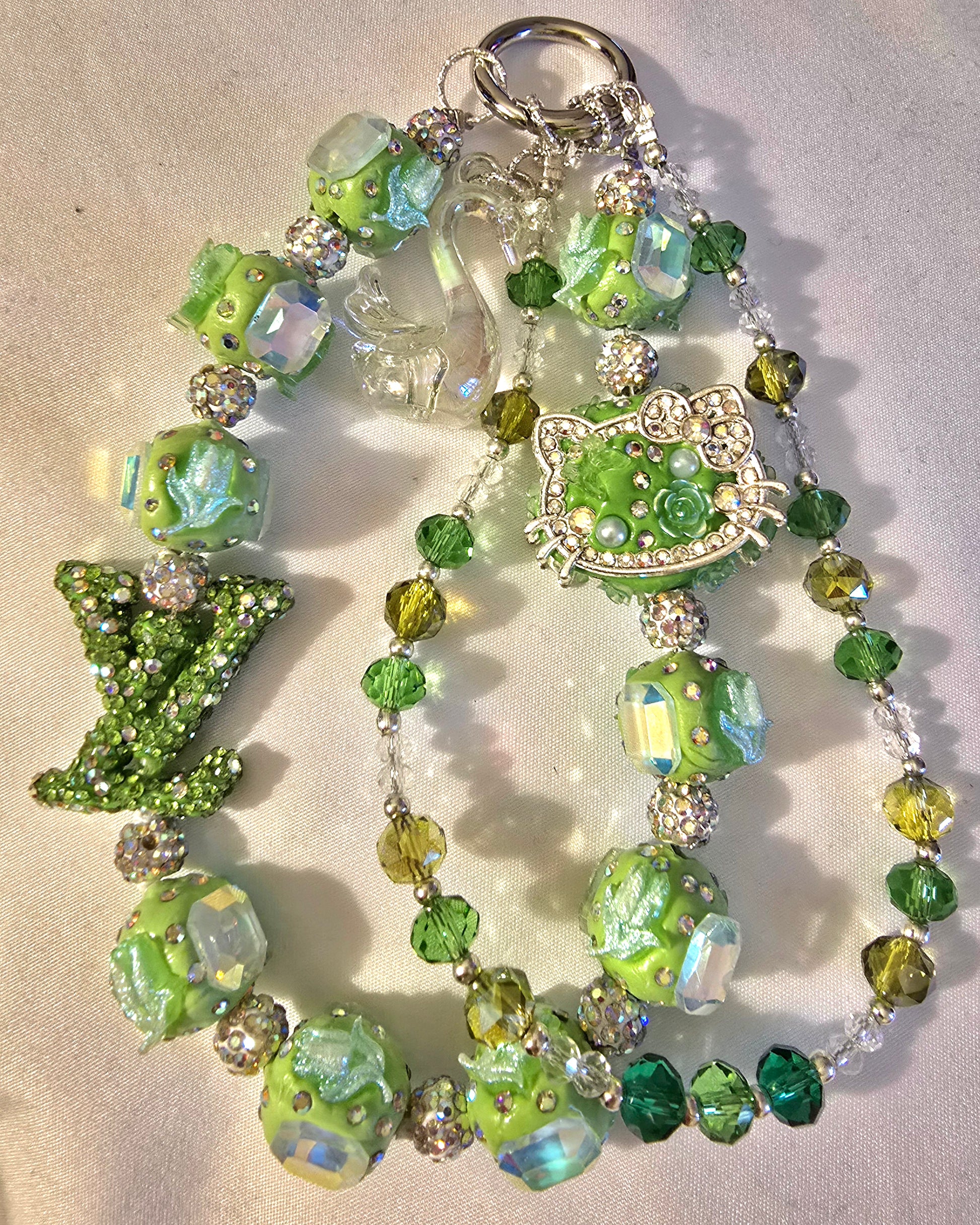 This accessory is an enchanting medley of textures and tones that feels like a stroll through a magical forest. Lush green dominates the palette—from the oversized beads with marbled swirls to the shimmering rhinestone-studded letter "LV" that adds a personal, high-fashion twist. Accents of iridescent and silver beads catch the light like fairy dust, while the clear swan charm evokes elegance and grace.
