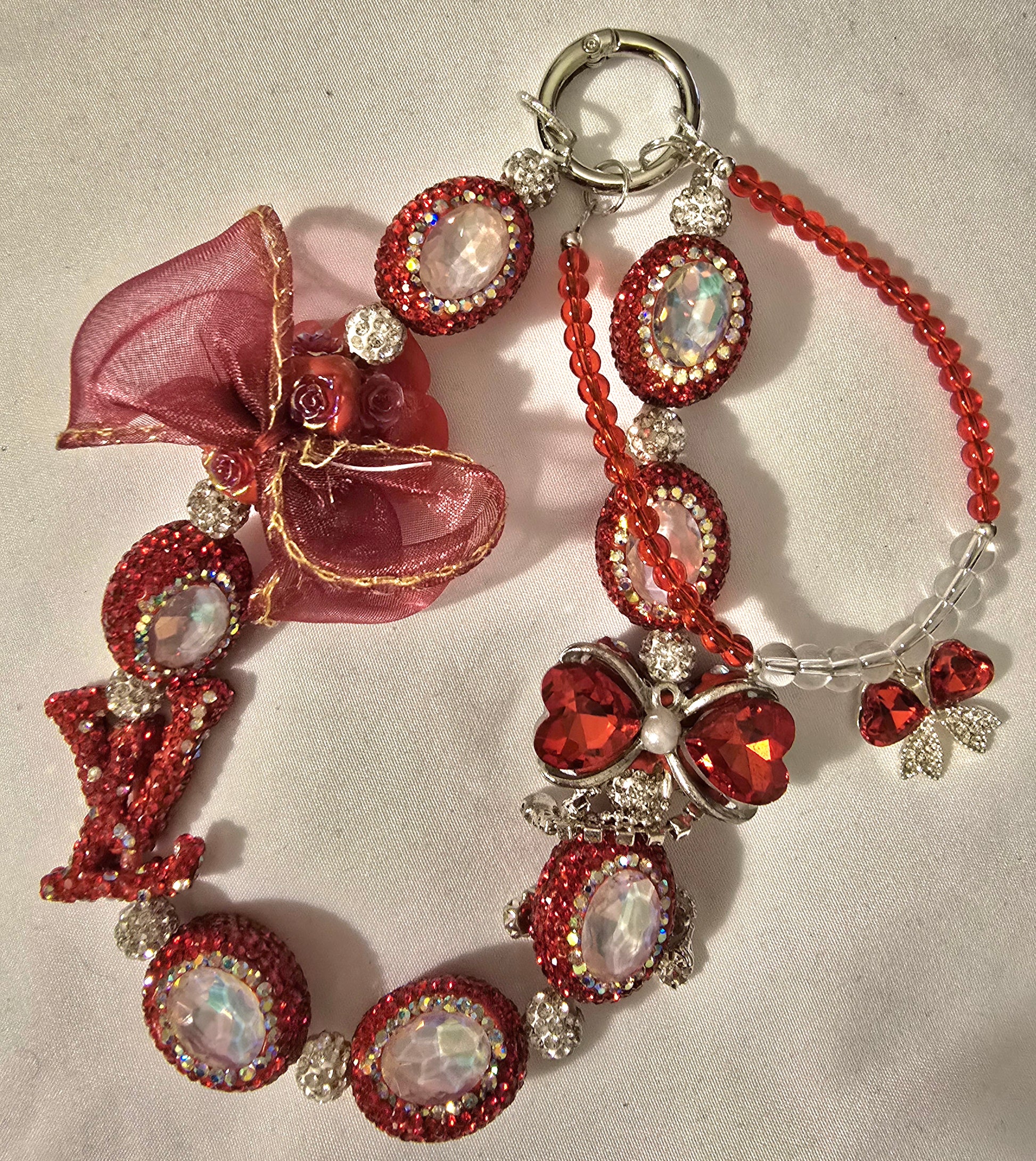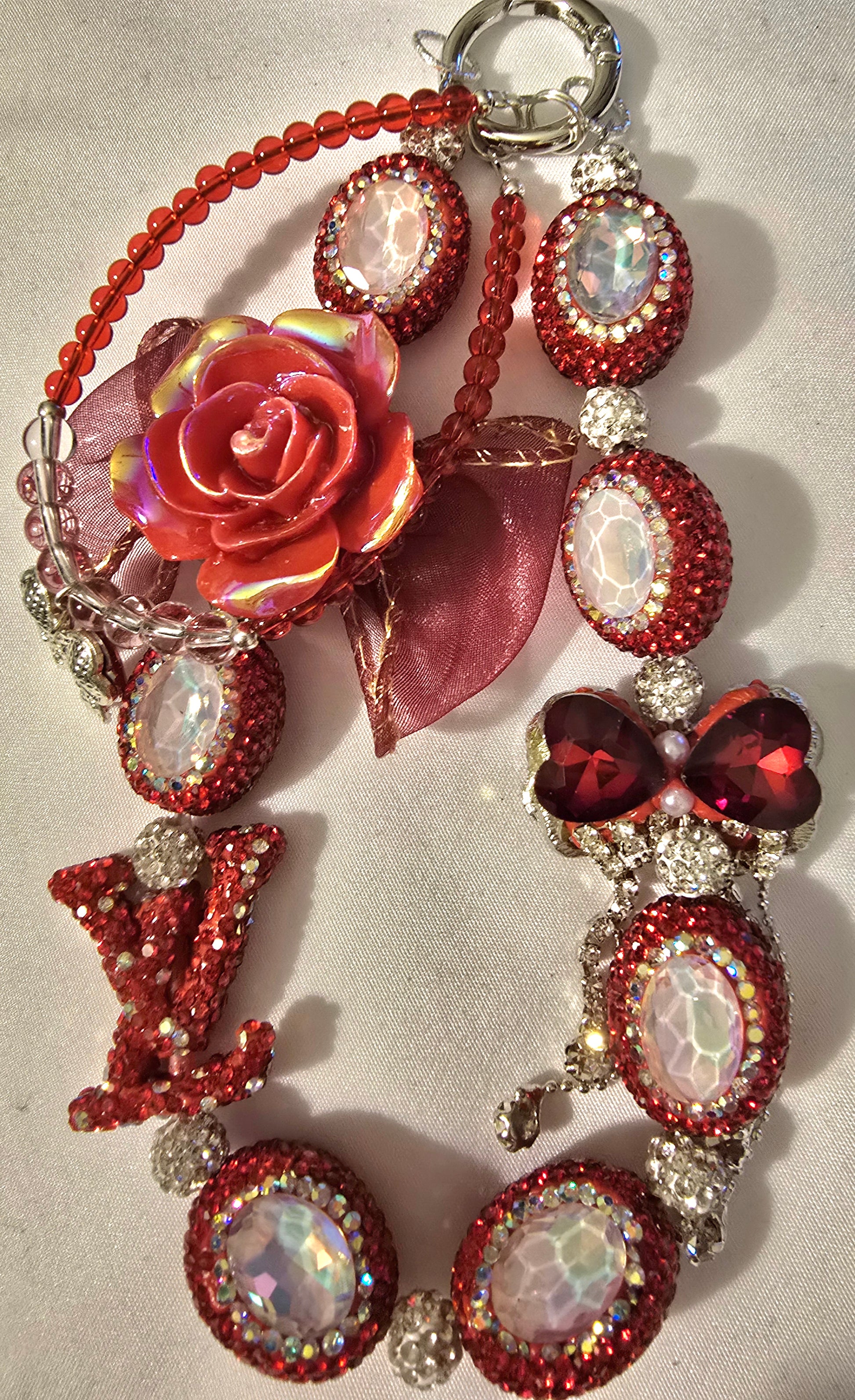 🌹✨ This accessory bursts with glam and attitude. It’s a statement chain/charm piece that flaunts a fiery red palette anchored by luxe detailing: