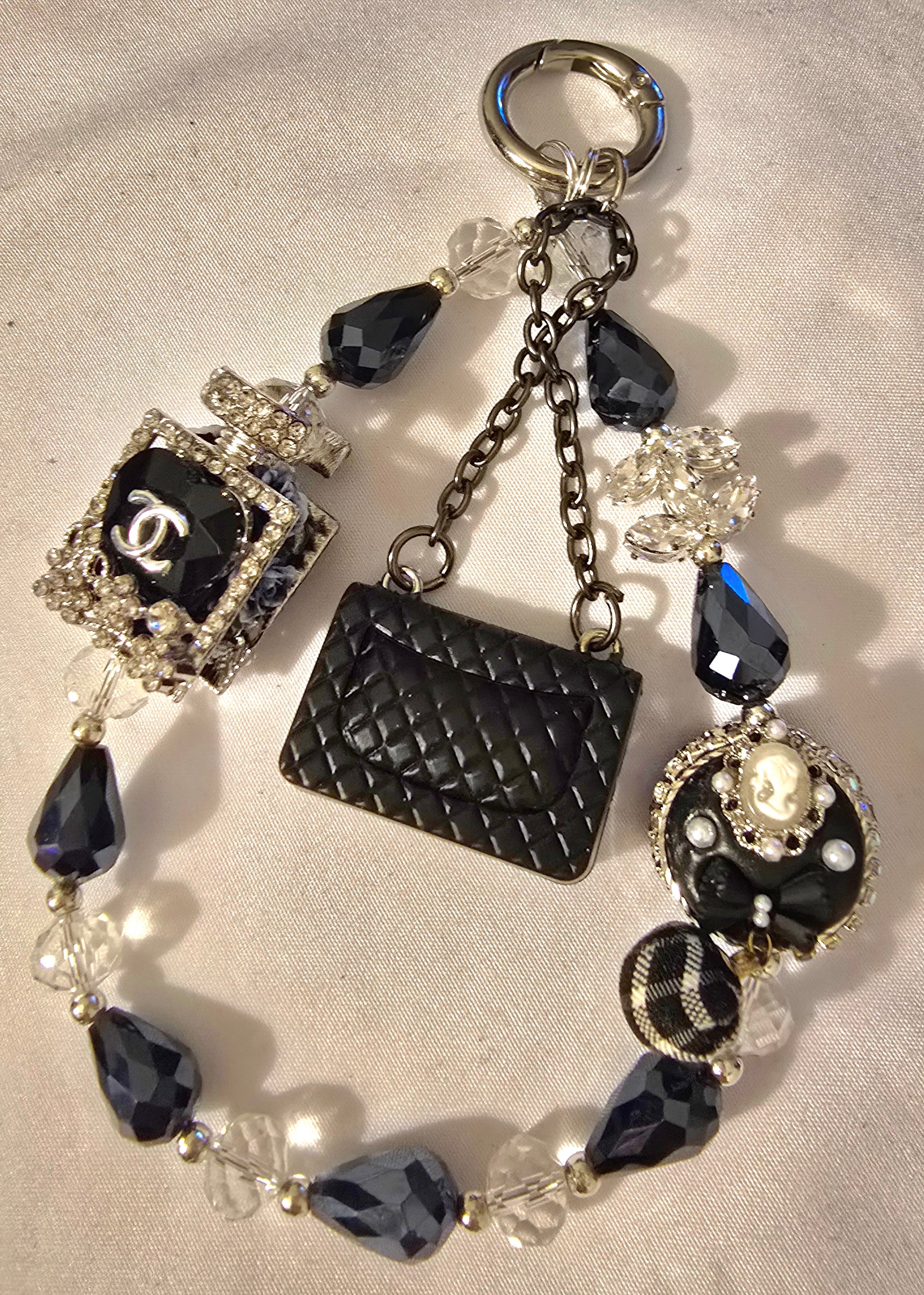 This designer chain blends glamour and charm in one compact form. Anchored by a polished metal ring, it showcases a cascade of glossy beads and rhinestone details that shimmer with movement. A quilted handbag charm takes center stage, flaunting the iconic double-C emblem with timeless elegance. Surrounding it, a glossy black circle charm and a sparkling perfume bottle echo the same motif, adding layers of sophistication and flair. This statement piece is perfect for lovers of luxe who appreciate small details that speak volumes. Whether clipped to a bag, backpack, or set of keys, it turns the everyday into a fashion moment.