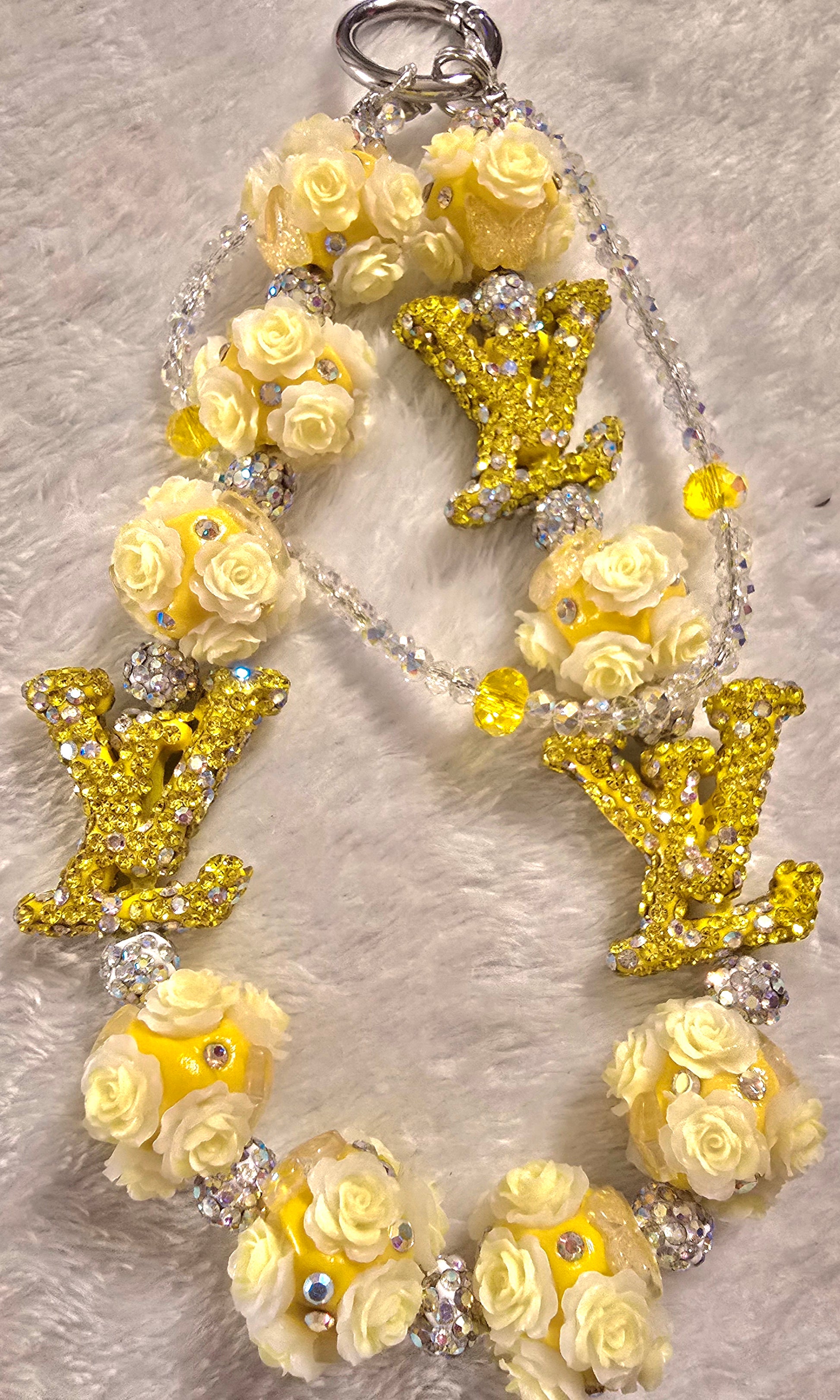 - Oversized “LV” initials: Encrusted in yellow rhinestones, they make a loud and luxurious statement—clearly nodding to designer iconic aesthetic.