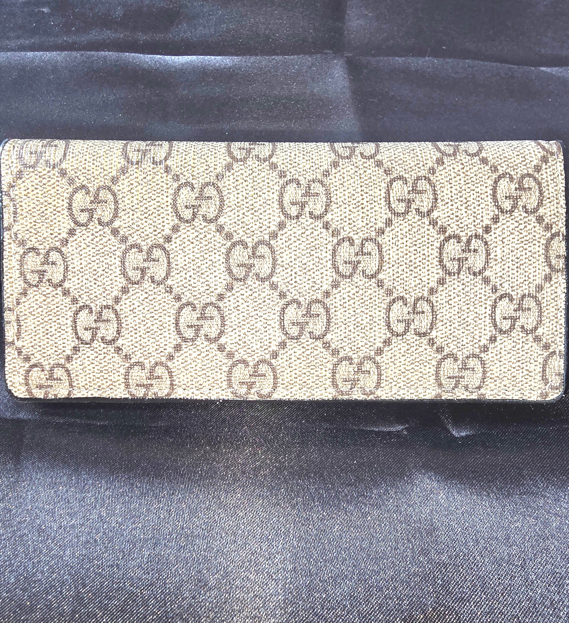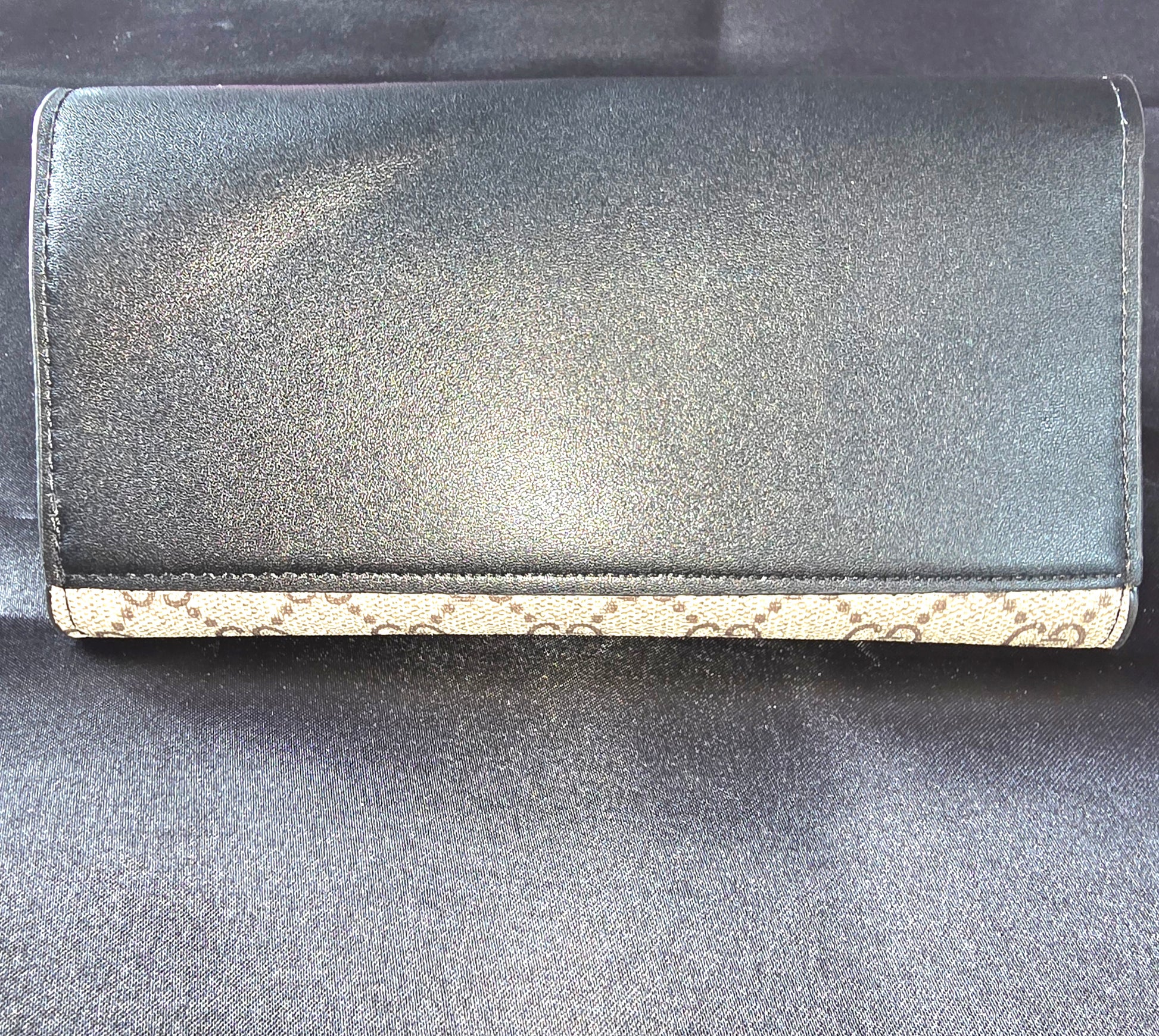 Nestled of black satin, against a backdrop this GG wallet exudes quiet opulence. The design features a striking two-tone composition: a sleek black leather flap paired with a beige canvas base adorned in the iconic flap is crowned GG monogram. The with a gleaming gold double-G emblem—an unmistakable nod to designer heritage of luxury.